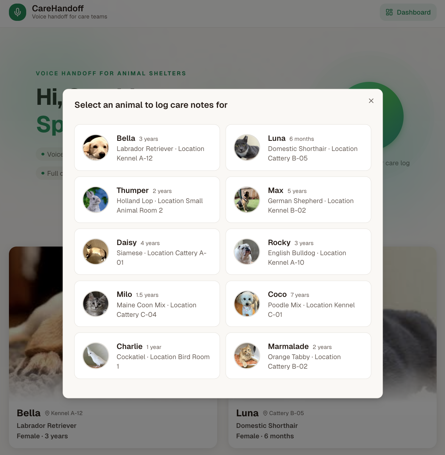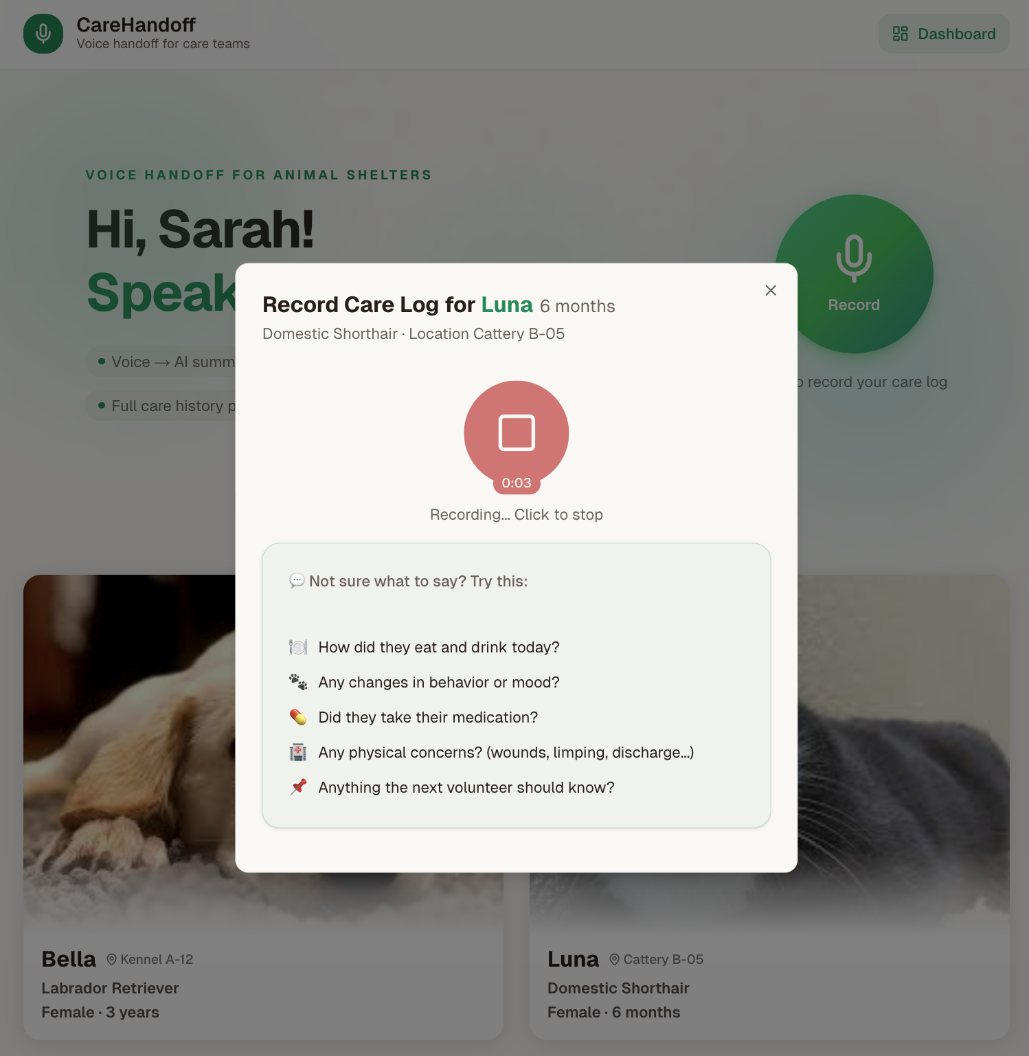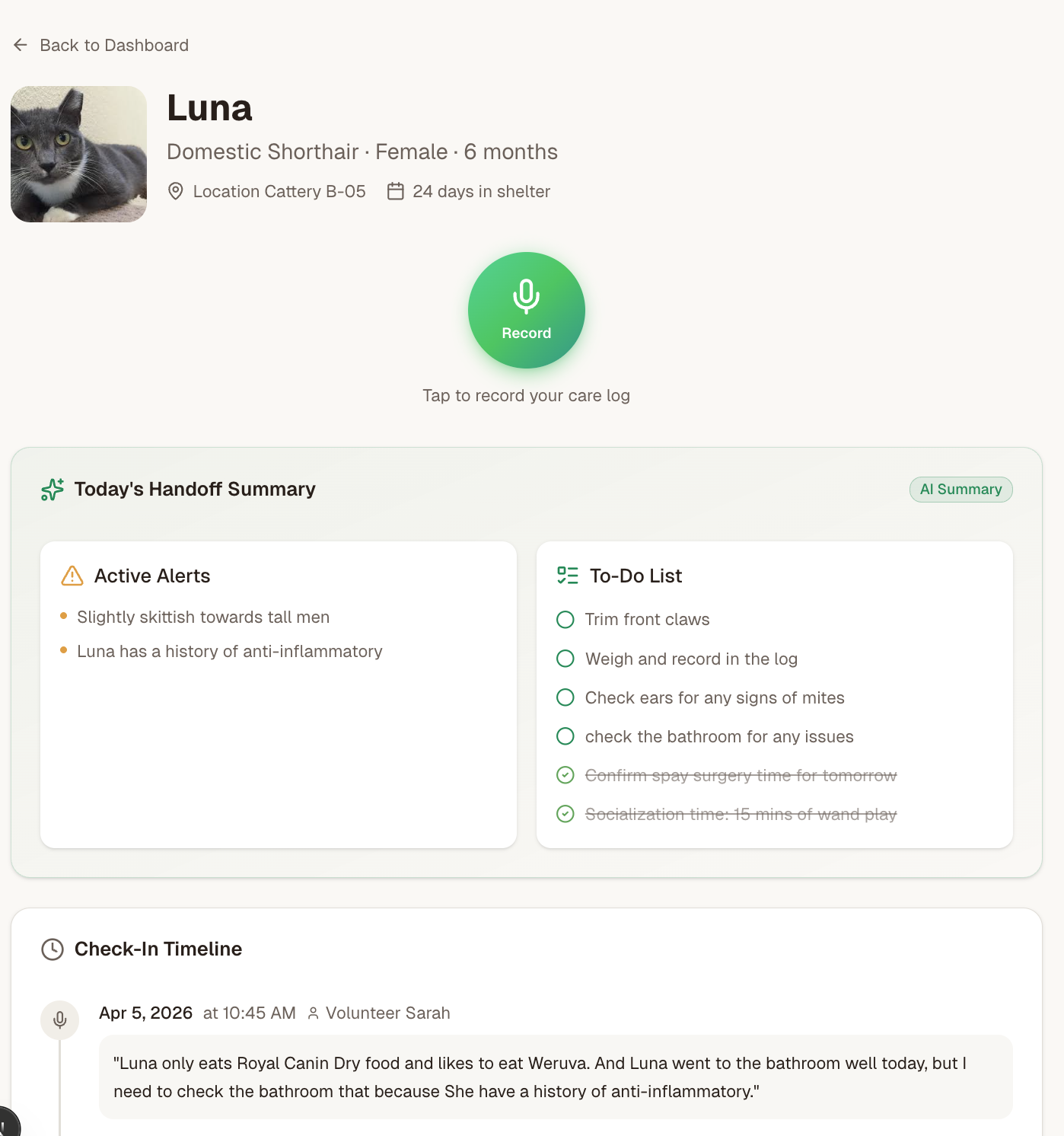 CareHandoff is a seamless, voice-first dashboard. Volunteers simply speak their updates after checking on an animal. The app automatically transcribes the audio, extracts key alerts, and generates a structured care log.