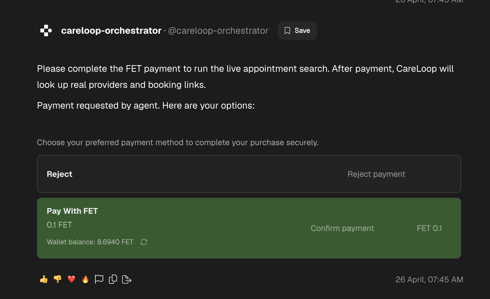 Users can interact through ASI:One or Telegram. In ASI:One, CareLoop uses native Fetch.ai payment protocol cards for FET service fees. In Telegram, CareLoop demonstrates an OmegaClaw-style external channel with doctor booking, prescription image intake, testnet FET payment commands, Google Calendar, and caregiver email.