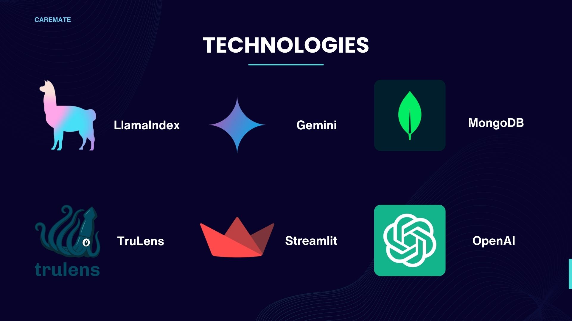 We constructed CareMate using a powerful combination of technologies, including Streamlit, Gemini, LlamaIndex, MongoDB, ChatGPT, and Trulens. Leveraging Google's LLM (Large Language Models), we imbued our AI with the ability to provide medical advice based on a vast database of medical knowledge stored in our vector database. Each component of our framework underwent rigorous testing and optimization using Trulens evaluation functions.