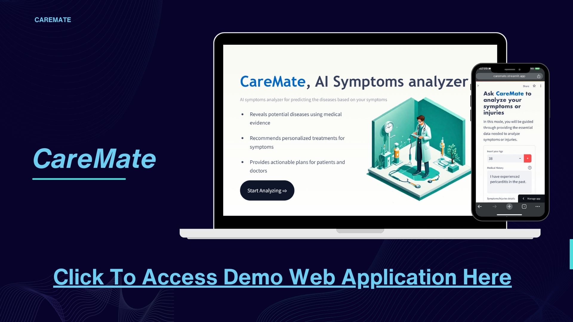 Welcome to CareMate: Your trusted medical advisor at your fingertips. CareMate predicts diseases from patient symptoms and provides actionable diagnosis and treatment plans for both patients and doctors.