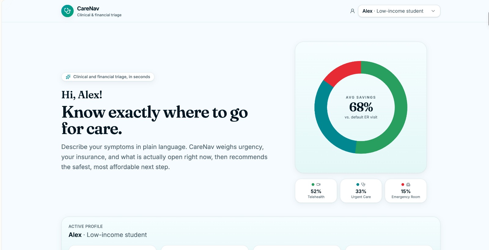 CareNav was built over a weekend sprint, operating as a sophisticated clinical and financial triage engine powered by Claude.