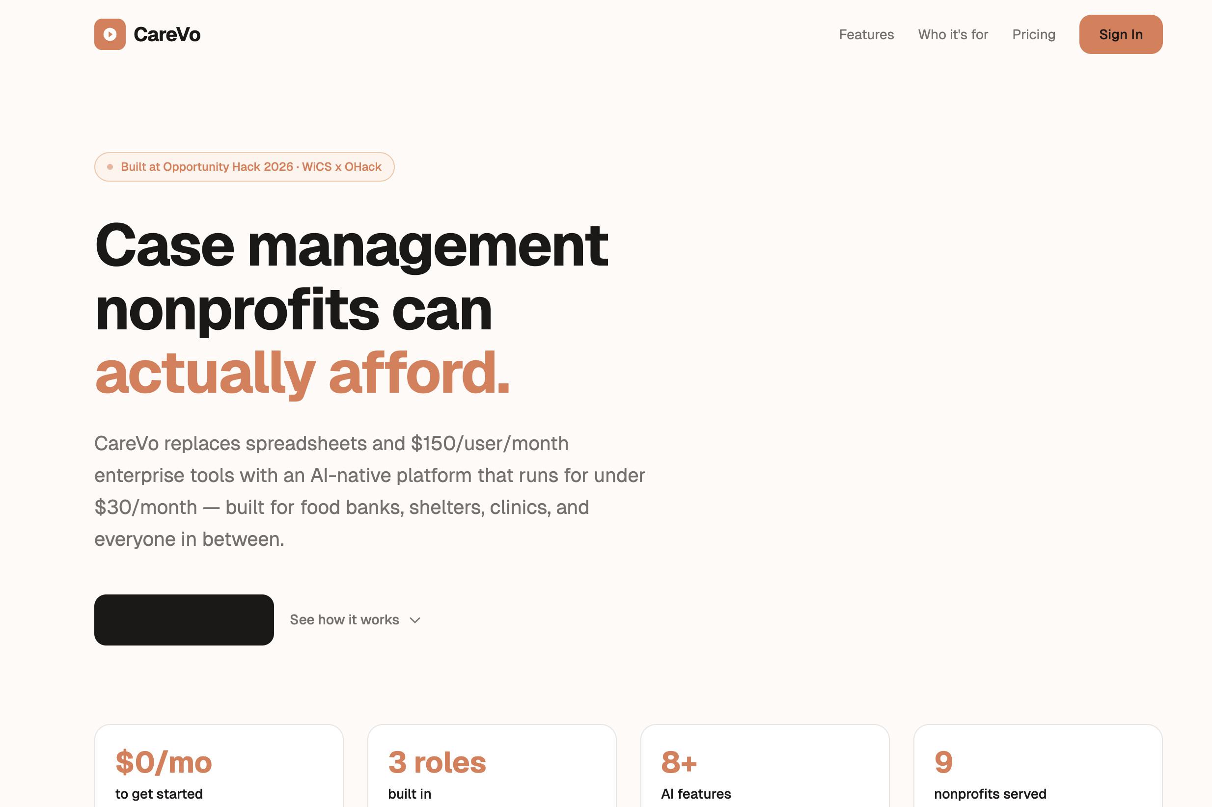 Walking into a nonprofit service event, you see the chaos immediately: volunteers with clipboards, paper forms stacked on folding tables, clients waiting while staff scramble to find last week's intake sheet. Data gets lost. People get missed. We kept asking ourselves: why are the communities that need the most help being served by the least modern tools? That question became Carevo