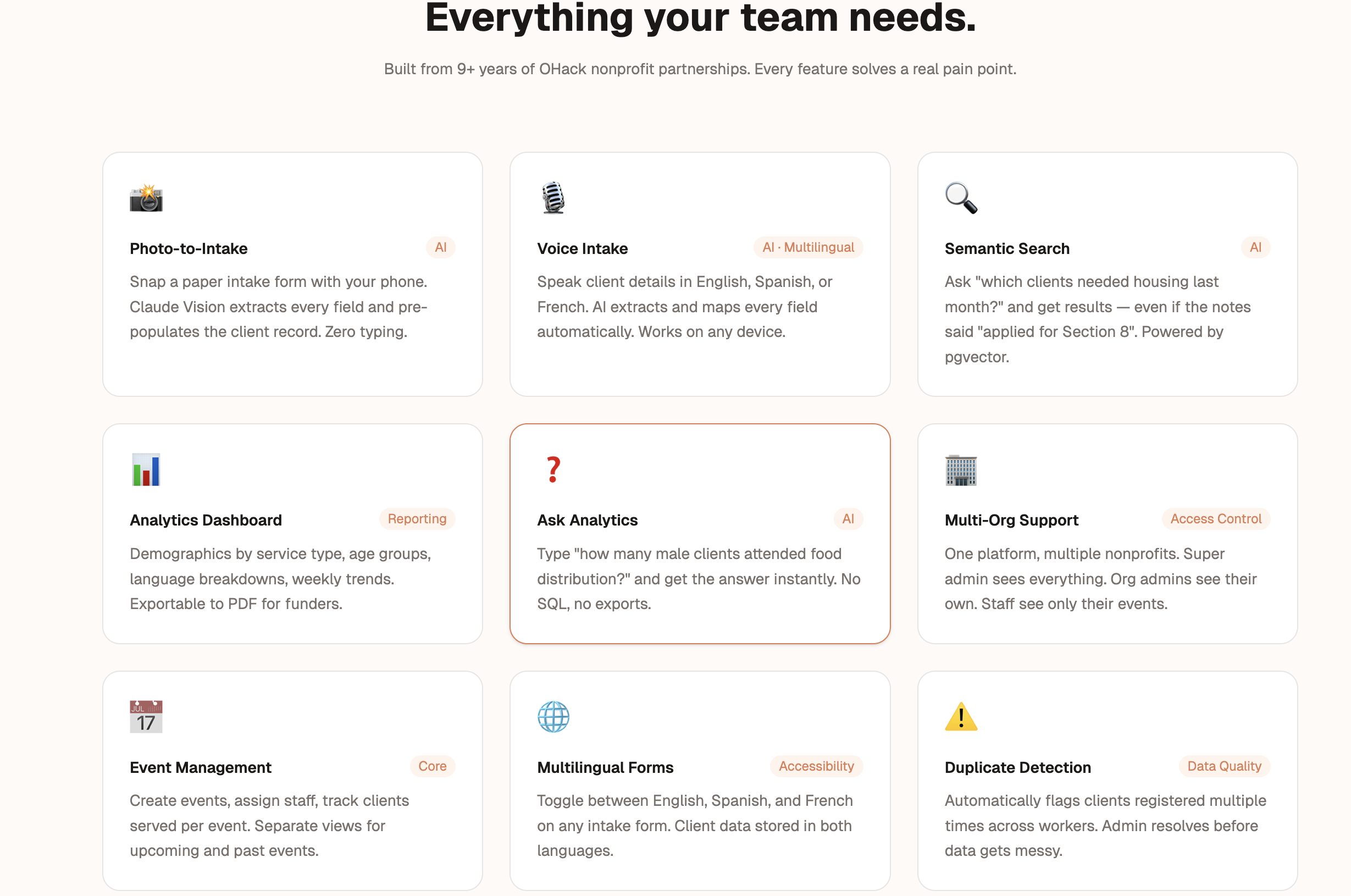 We're proud that a volunteer with no technical background can walk up, open the app, scan a form, and have a client registered in under 30 seconds. The multilingual support feels genuinely useful, not just a checkbox. And the natural language analytics dashboard asking a question in plain English and getting a real answer about your community felt like a real breakthrough moment for the team.