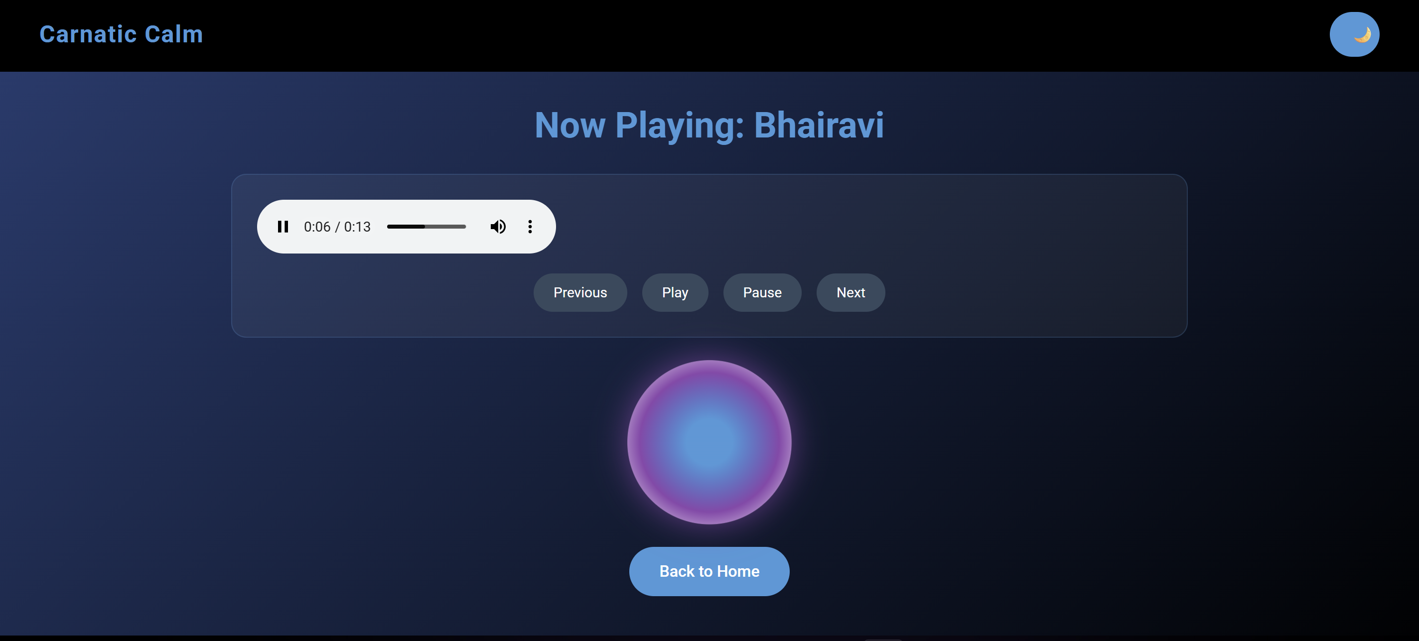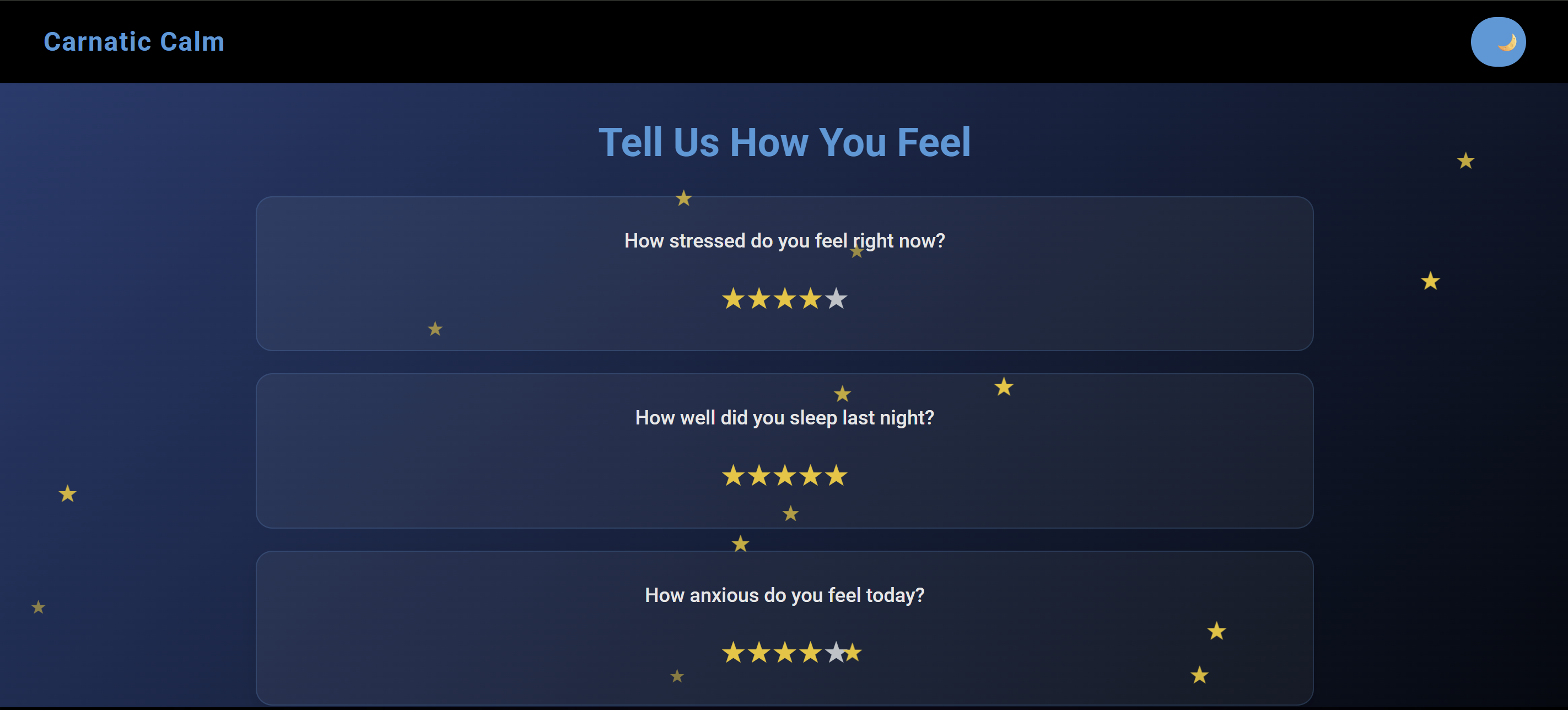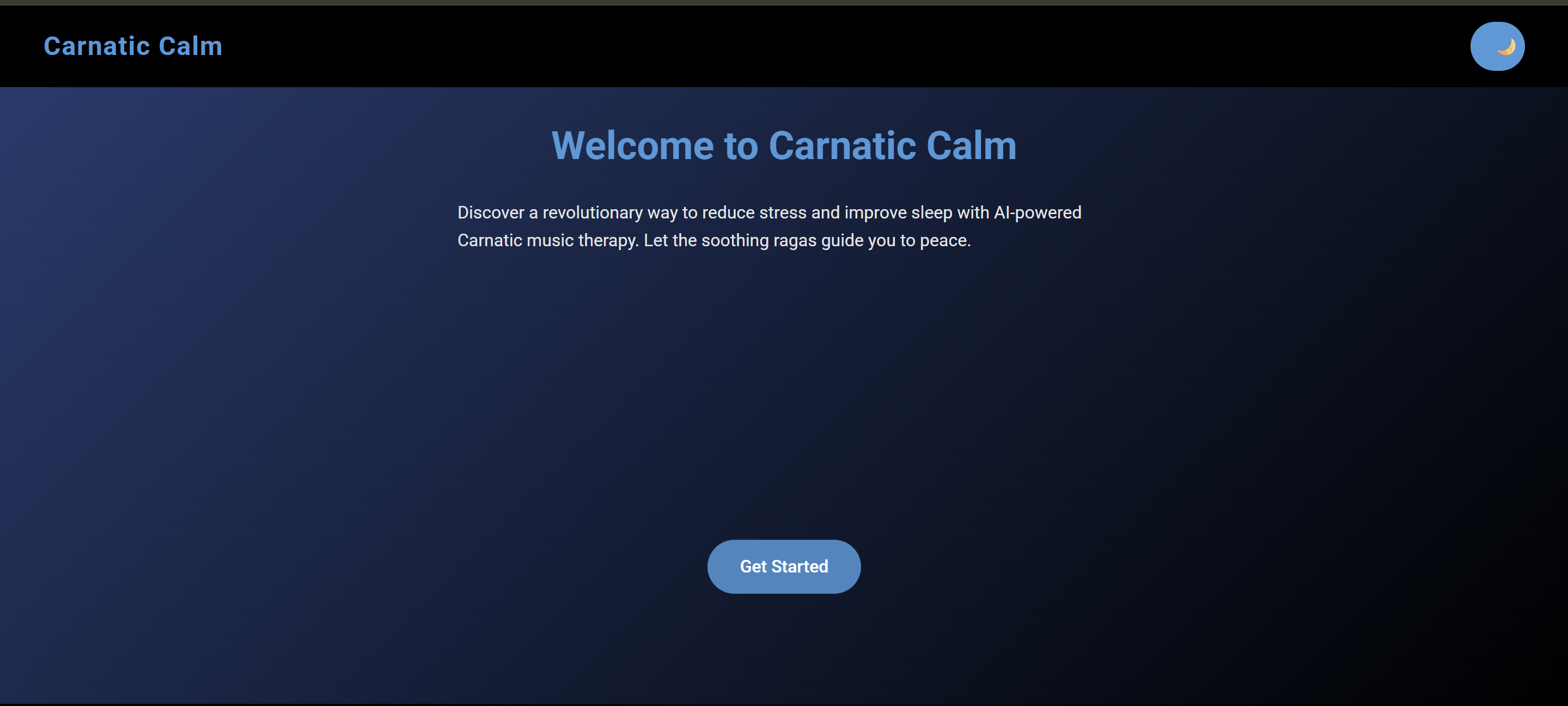 CARNATIC CALM takes user inputs on stress, sleep, anxiety, and energy levels, analyzes their mental state, and recommends specific Carnatic ragas known to alleviate that condition. It then provides instant access to audio tracks to help restore emotional balance.