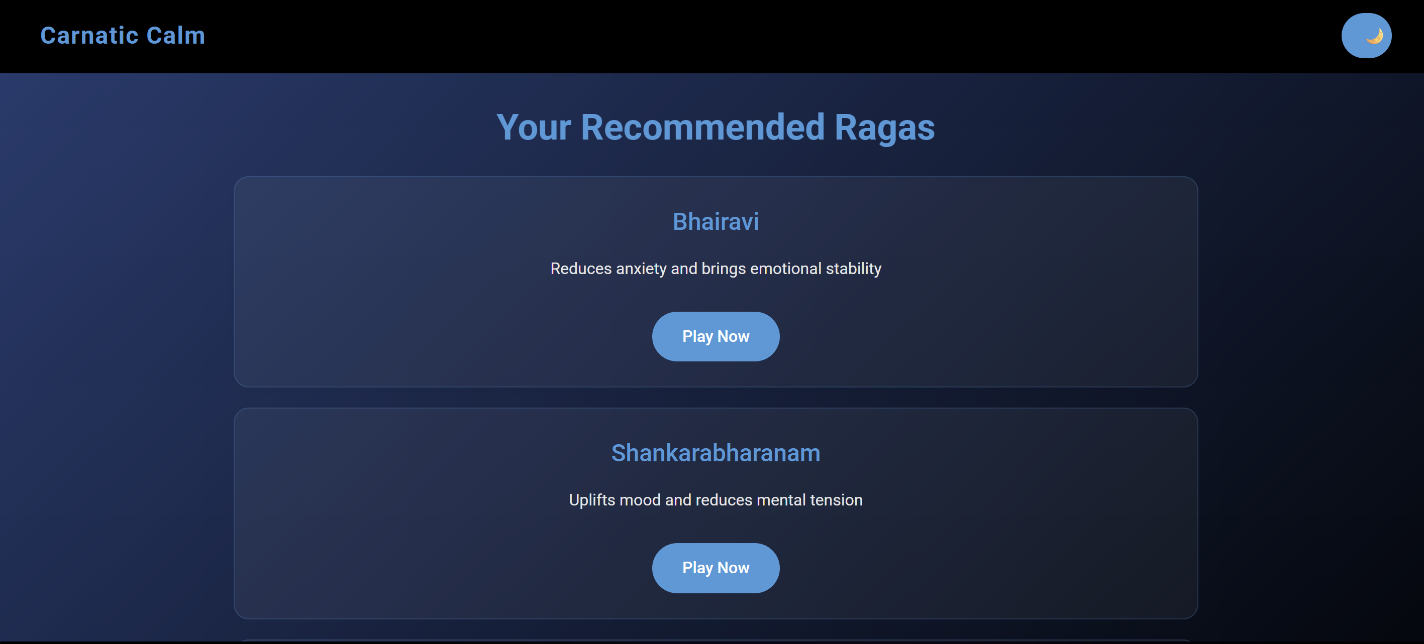 Mental health issues like stress, anxiety, and sleep disturbances are rising, especially among students and professionals. We wanted to blend ancient Indian healing traditions with modern tech—thus, the idea of recommending Carnatic ragas based on mood was born.