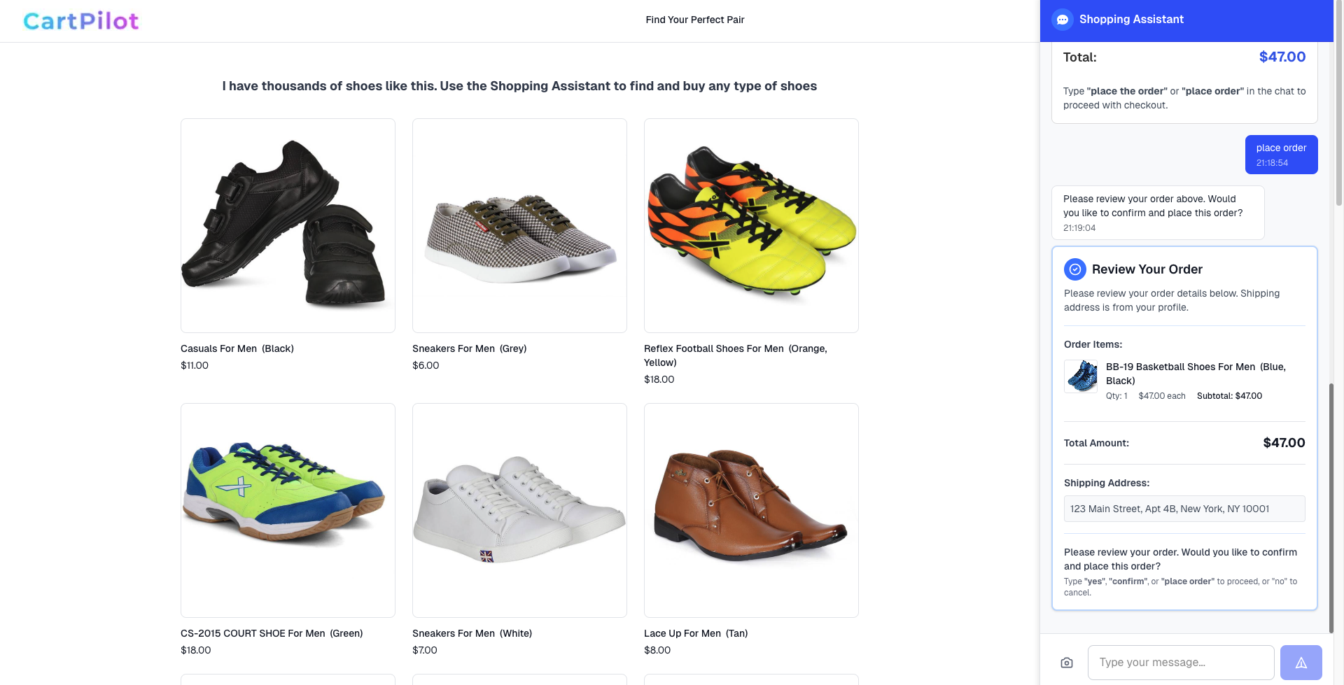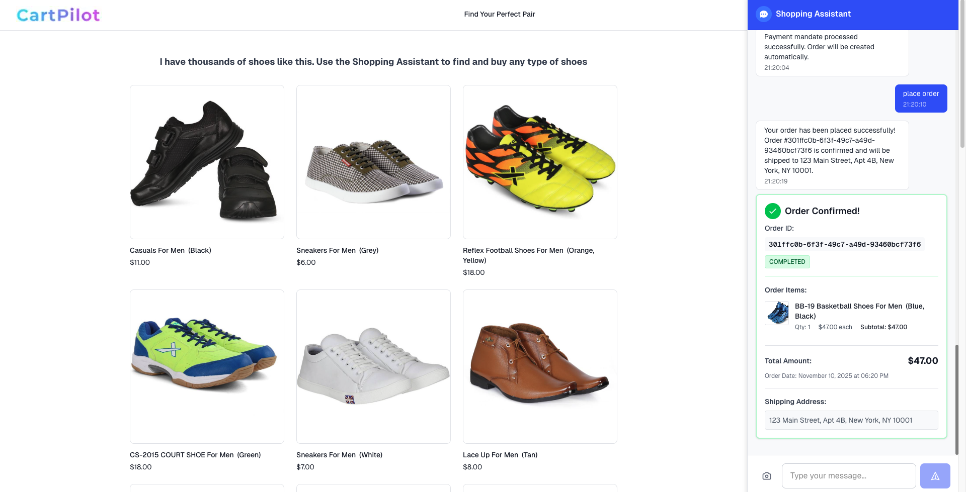 Cart Pilot transforms the traditional e-commerce experience into a natural conversation. Instead of navigating complex interfaces, users simply tell the AI what they want—"Find me running shoes" or "Add the blue ones to my cart"—and intelligent agents orchestrate the entire shopping journey from product discovery to order placement. The system uses a hierarchical agent architecture: a Shopping Agent that routes requests, a Product Discovery Agent for semantic and visual search, a Cart Agent for cart management, a Checkout Agent for orders, a Payment Agent for secure payments, and a Customer Service Agent for support. All agents share state seamlessly through state["current_results"], state["cart"], and other keys, enabling seamless handoffs without explicit communication.