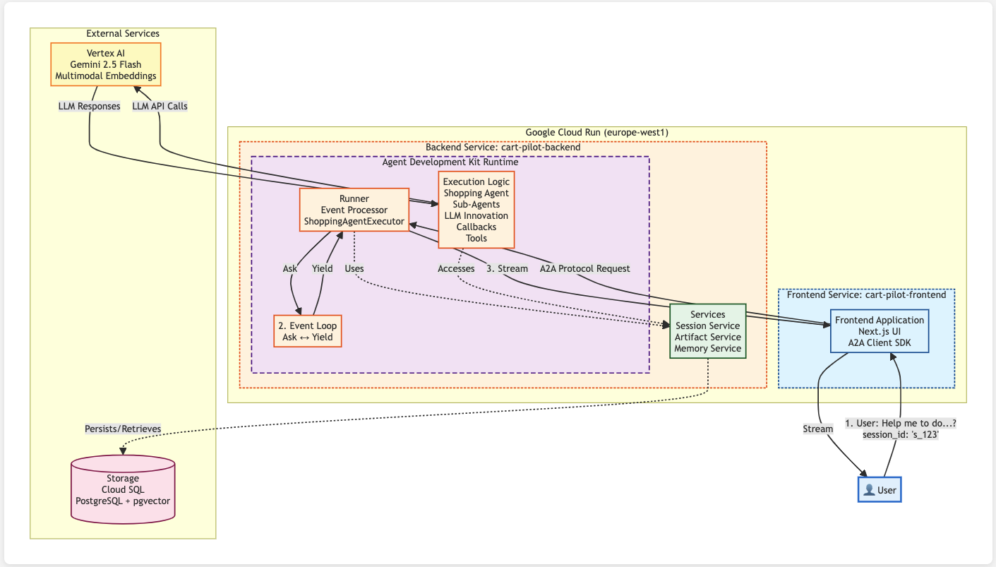 Cart Pilot was born from a simple frustration: watching someone struggle to find a product online, clicking through menus and filters, muttering "I just want to tell someone what I'm looking for." That moment sparked my vision—what if shopping could be as natural as conversation? I didn't want another chatbot; I wanted a system where specialized AI agents work together, each an expert in their domain, orchestrated by a master coordinator. The goal was to showcase the power of Google's Agent Development Kit (ADK) and the Agent-to-Agent (A2A) Protocol while solving a real problem: making e-commerce feel as natural as talking to a helpful salesperson.