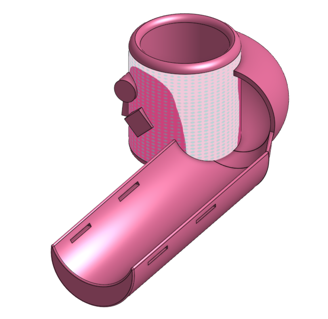 Using OnShape we split the cup holder and the arm brace into seperate parts via part studio. For the cup holder, we created the handwarming handle by sketching an arc, and then revolving the shape 90 degrees. With the arm brace, we designed two rows of slits where Velcro straps would rest inside, and we used the fillet tool to smoothen the edges to provide better comfort.