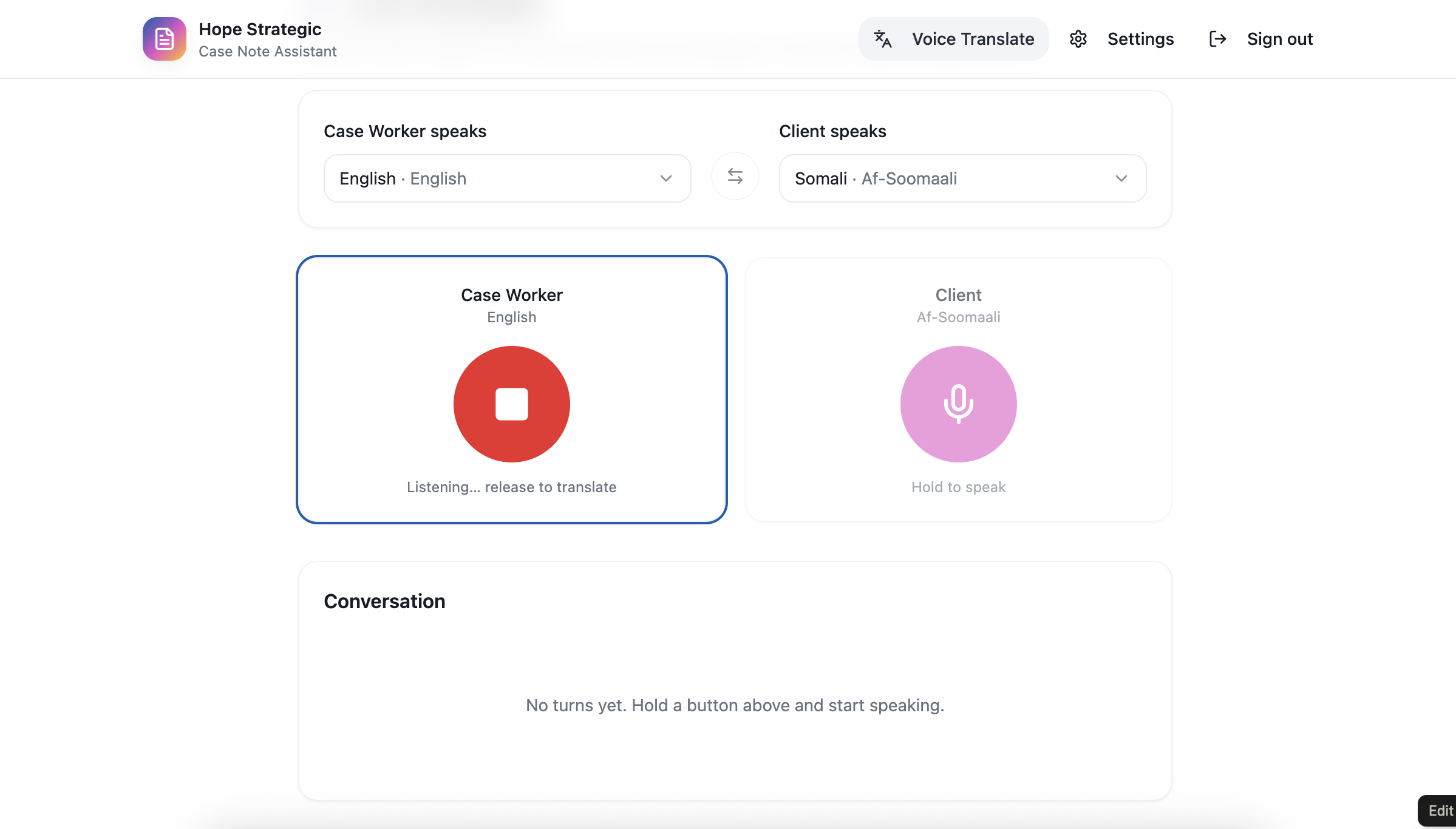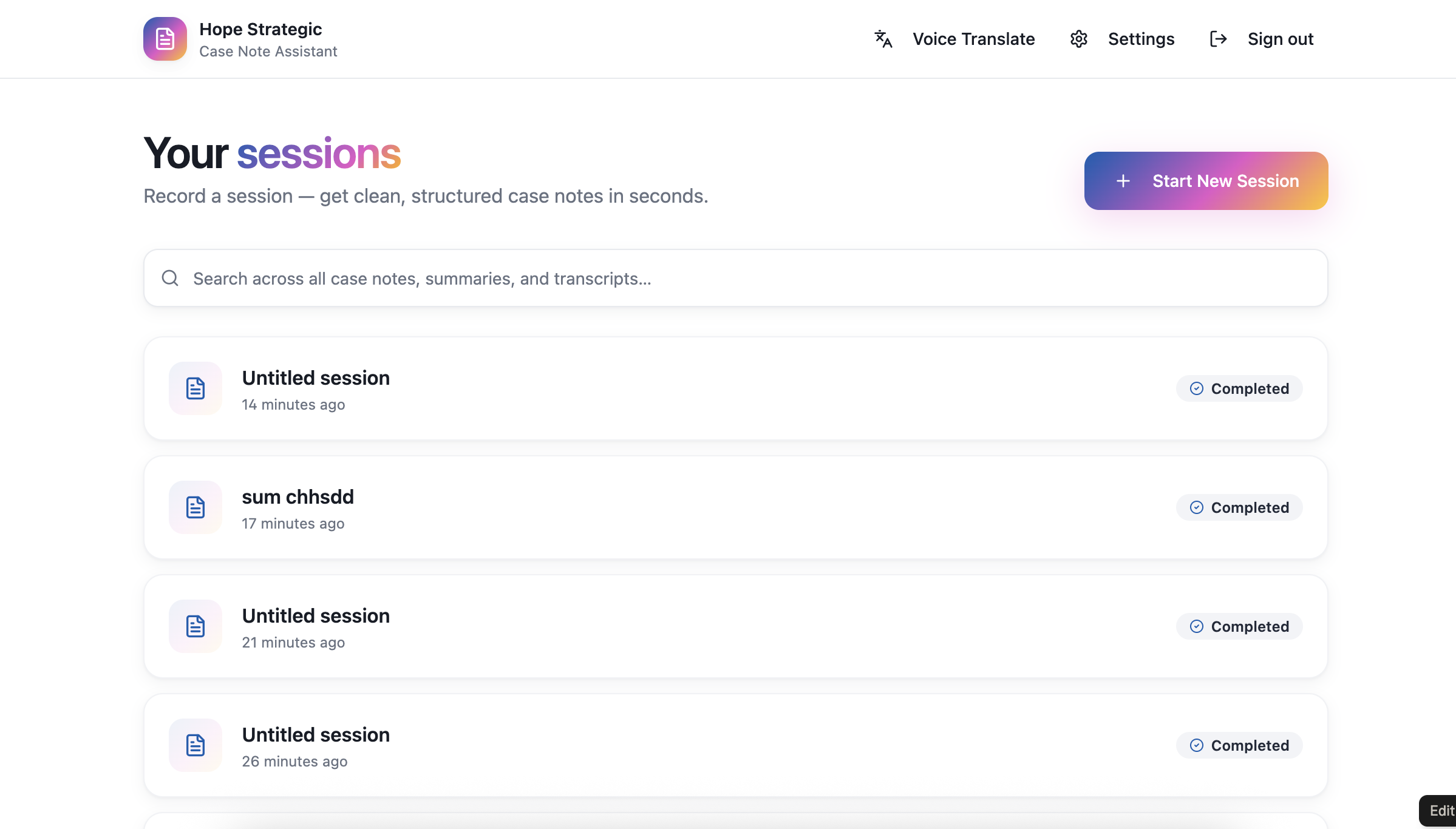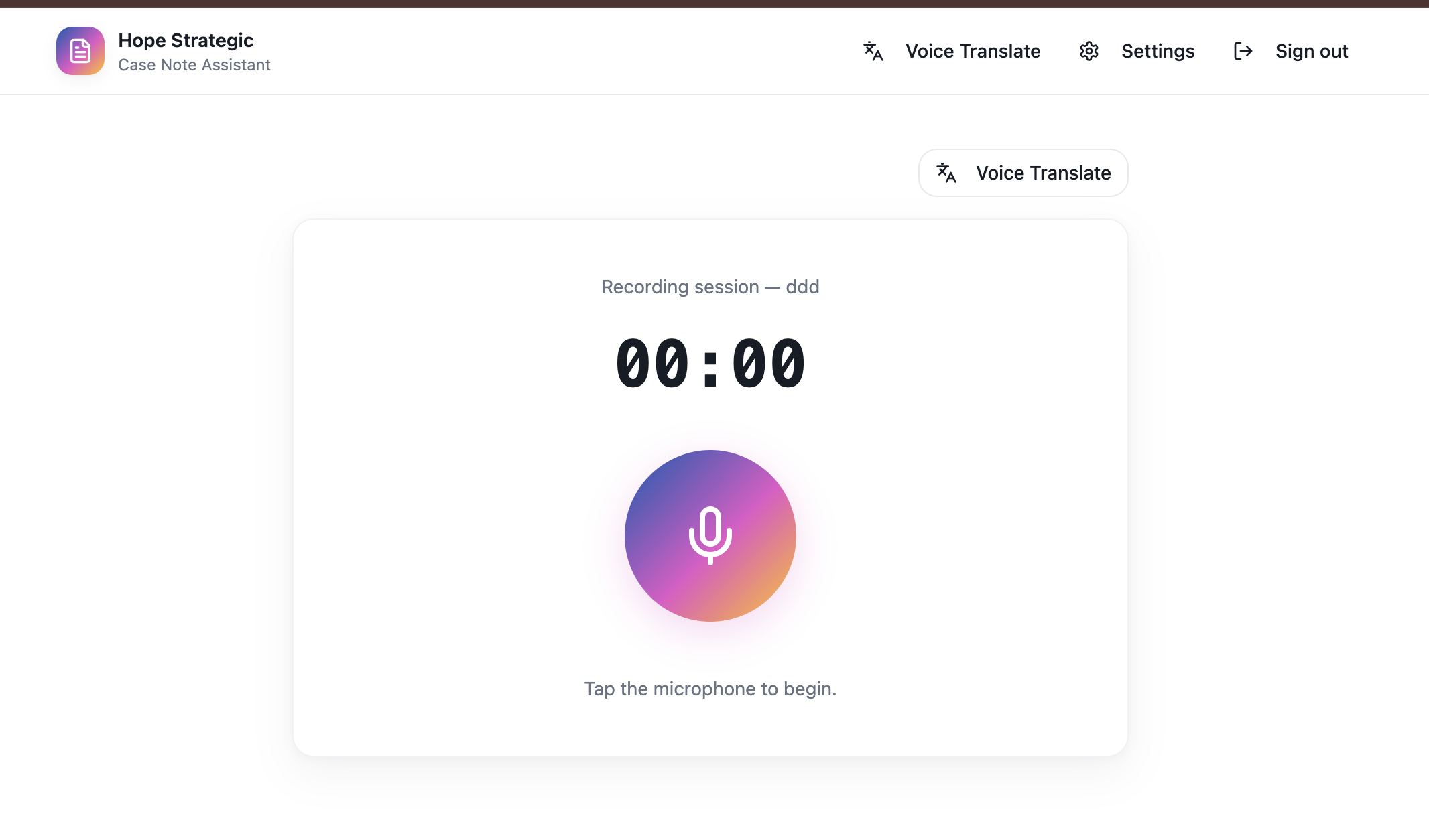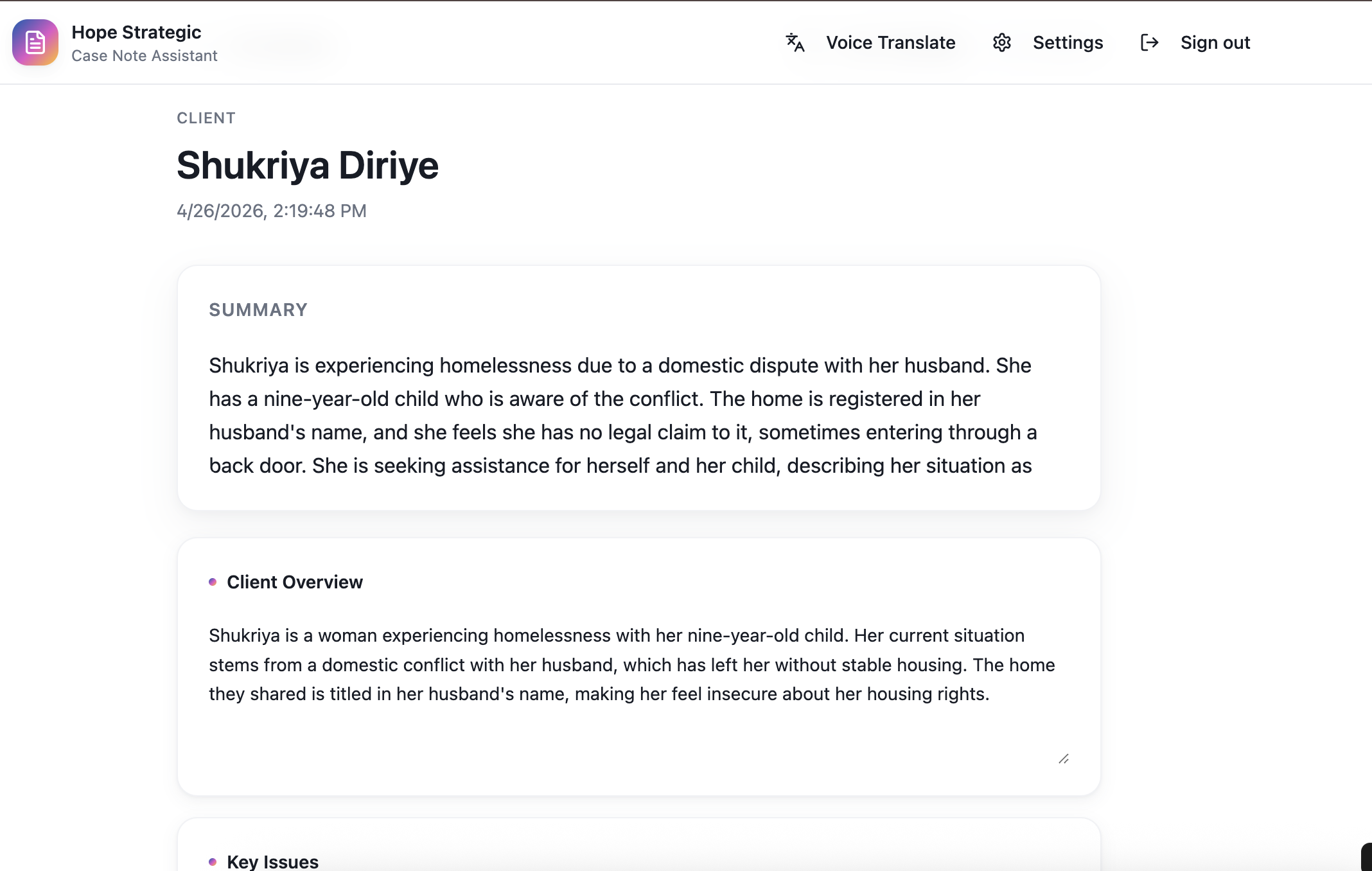 The Hope Strategic Case Note Assistant is an AI-powered tool that acts as a real-time assistant during client sessions. It records conversations (with consent), transcribes them, and automatically generates structured case notes, including client overview, key issues, important details, and action items. It also produces a concise session summary for quick review. Additionally, the app includes voice translation, allowing case workers and clients to communicate across languages more effectively. This helps improve understanding, reduce reliance on interpreters, and ensure more accurate information capture.