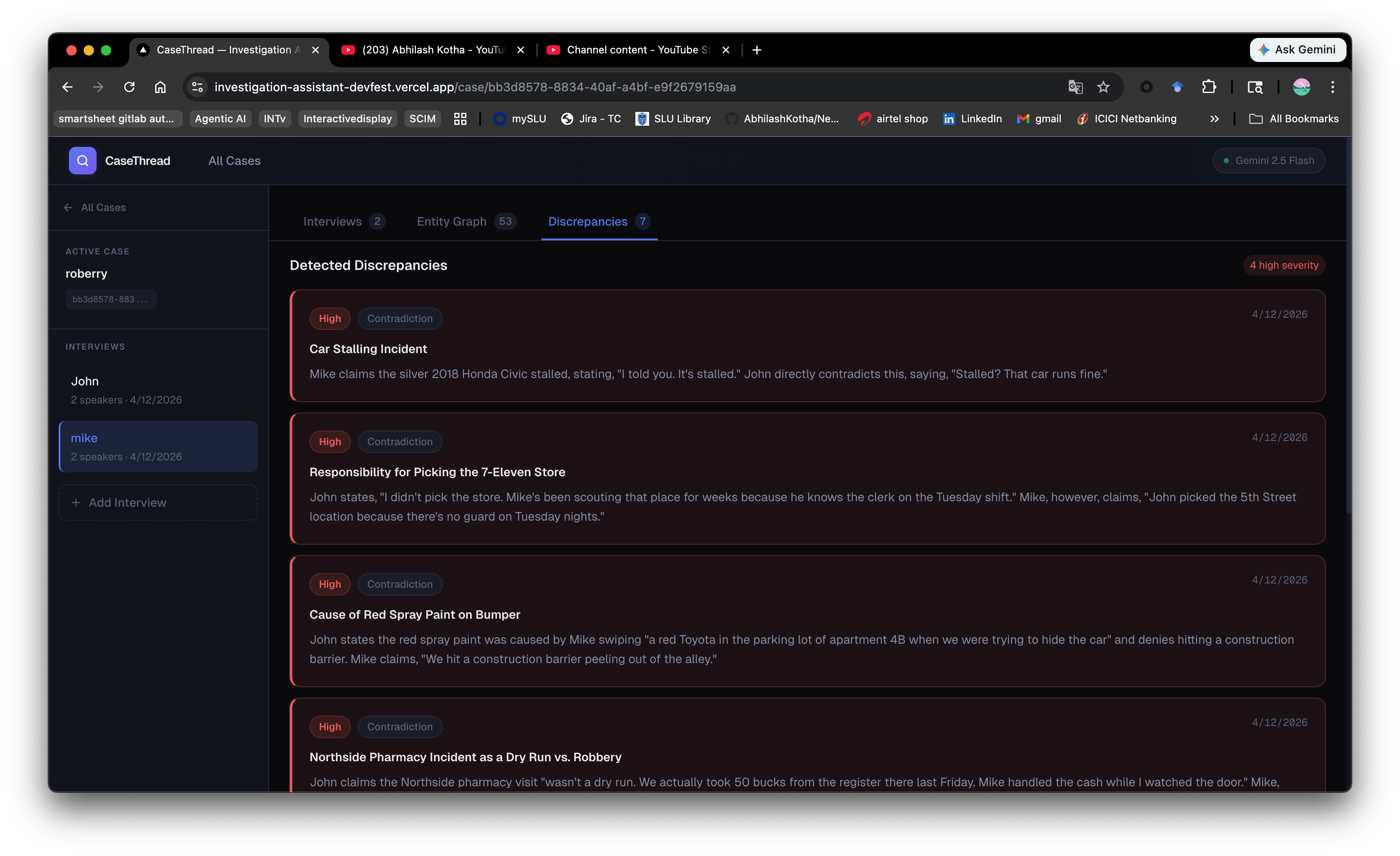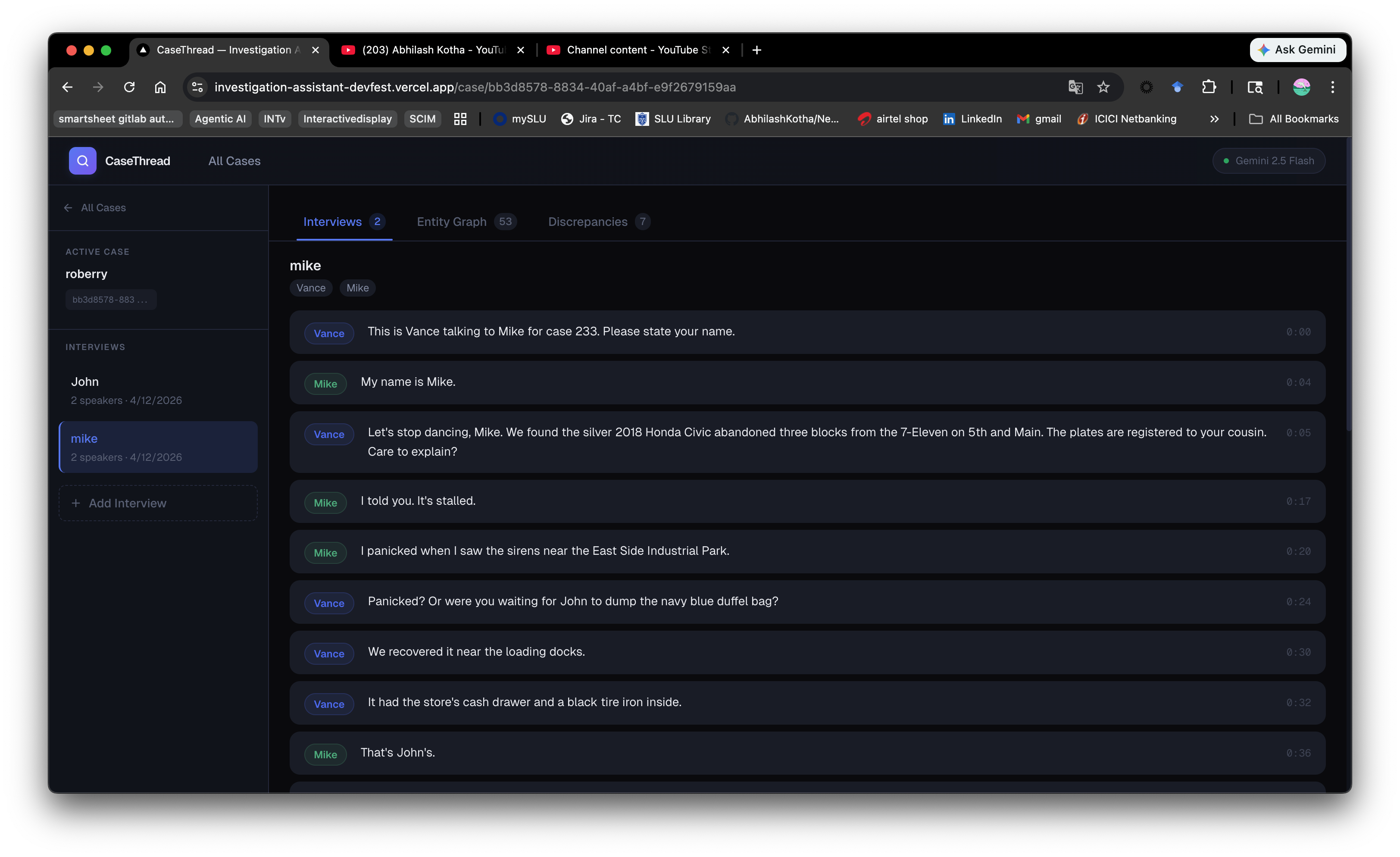 The core functionality - transcribe, identify speakers, extract entities, build graphs, detect discrepancies across 2+ interviews.