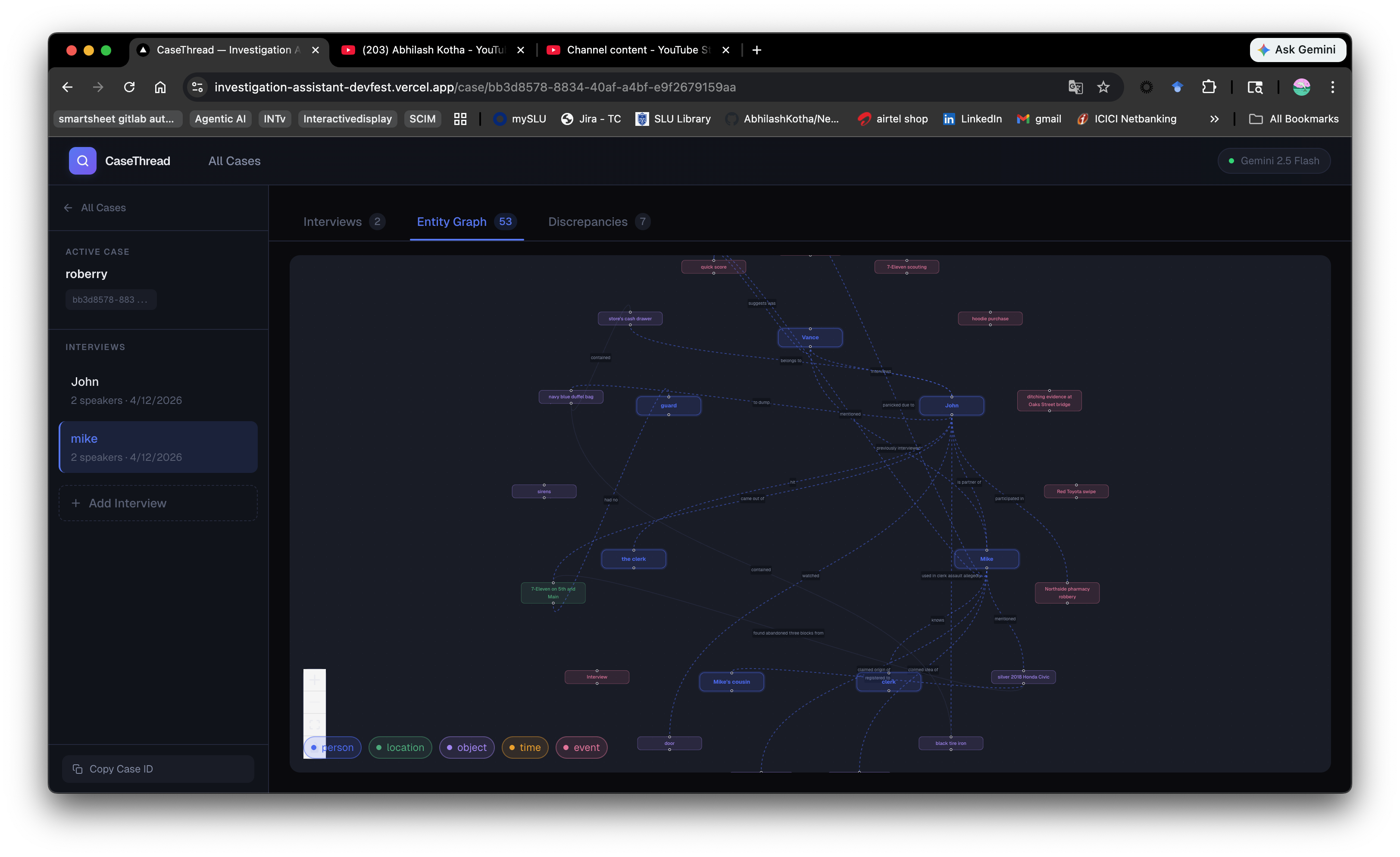 Key wins - accurate transcription, smart entity extraction, visual relationship graph, only running discrepancy detection with 2+ interviews (not wasteful).