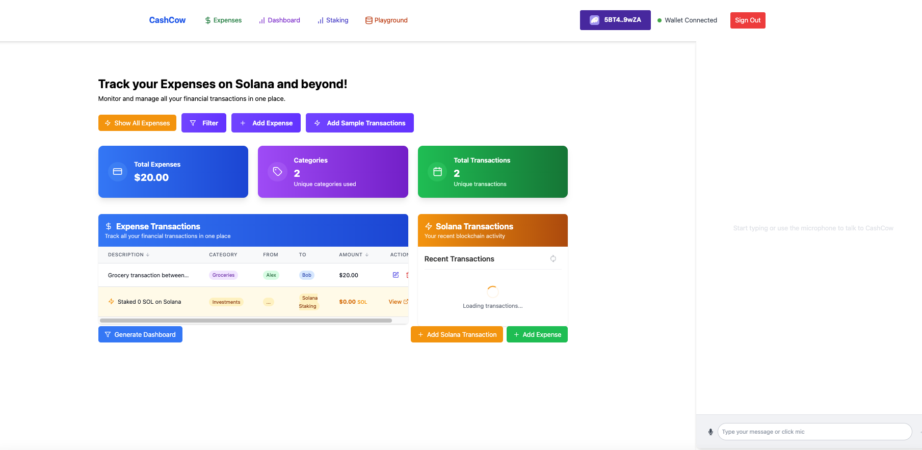 Managing personal finances effectively is a challenge for many individuals, often due to the complexity of budgeting, tracking expenses, and understanding financial trends. We envisioned CashCow as a revolutionary platform that bridges traditional finance with blockchain and AI, offering users an intuitive, transparent, and rewarding financial management experience. Inspired by the power of Web3, AI, and gamification, we aimed to create a tool that not only helps users track their spending but also incentivizes financial discipline through blockchain-based rewards.