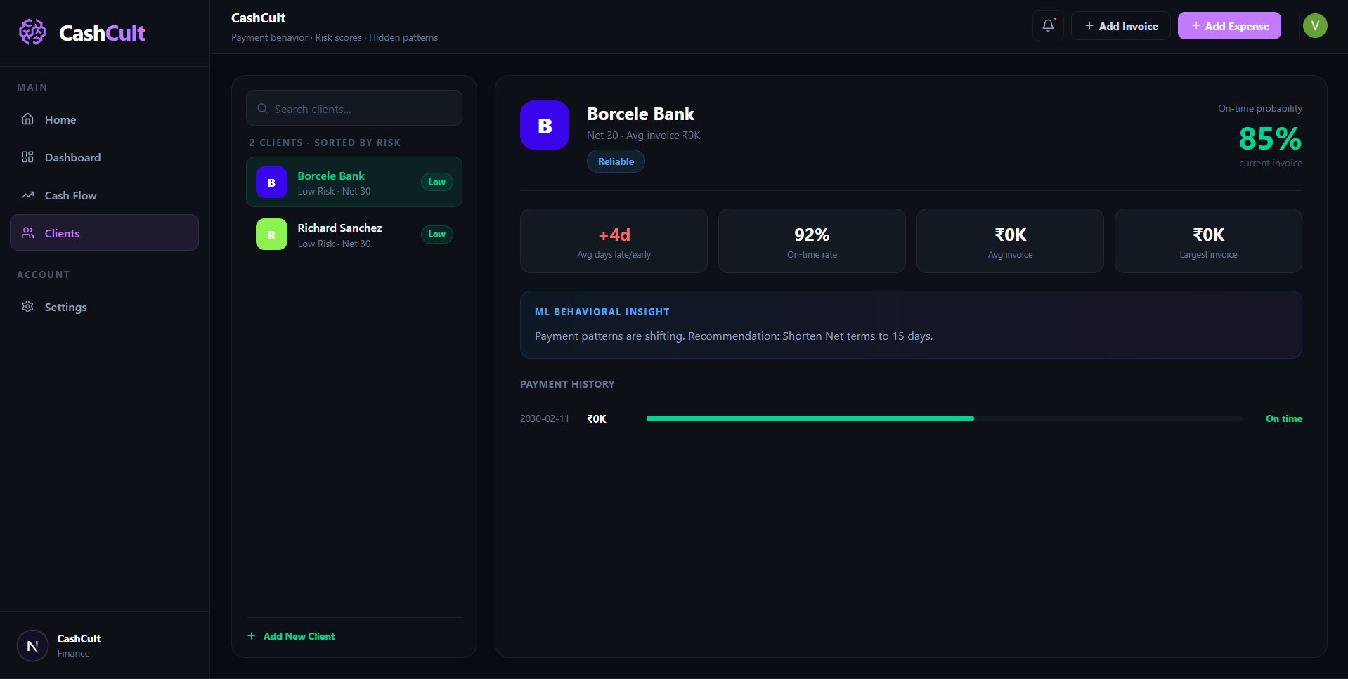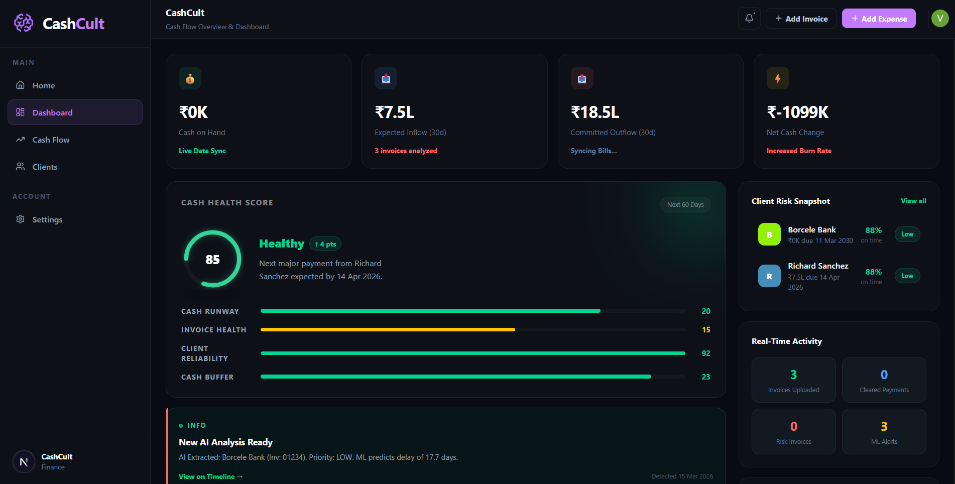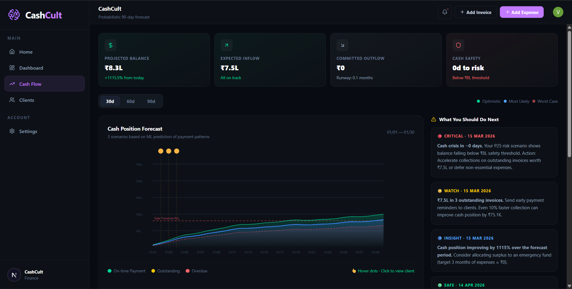 CashCult is a real-time cash flow intelligence platform. You upload your invoices (PDF or manual entry), and our ML pipeline automatically: