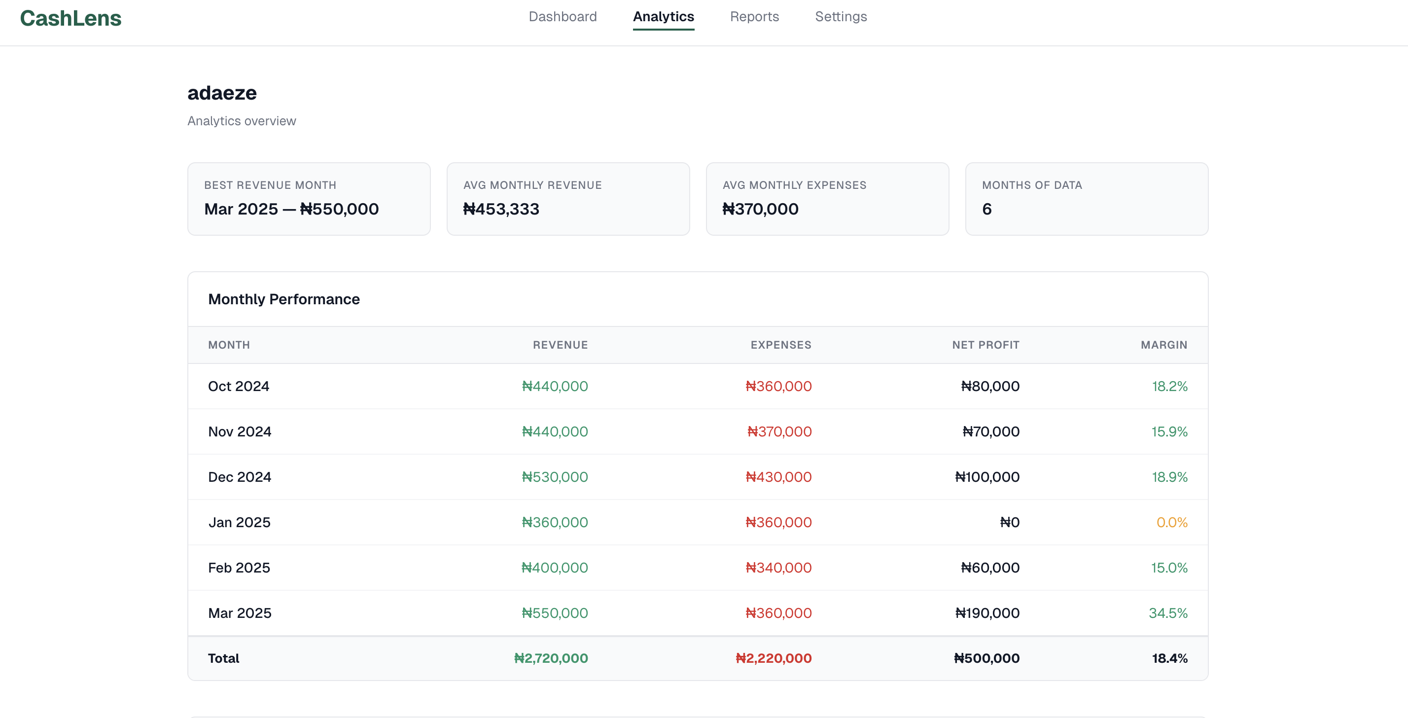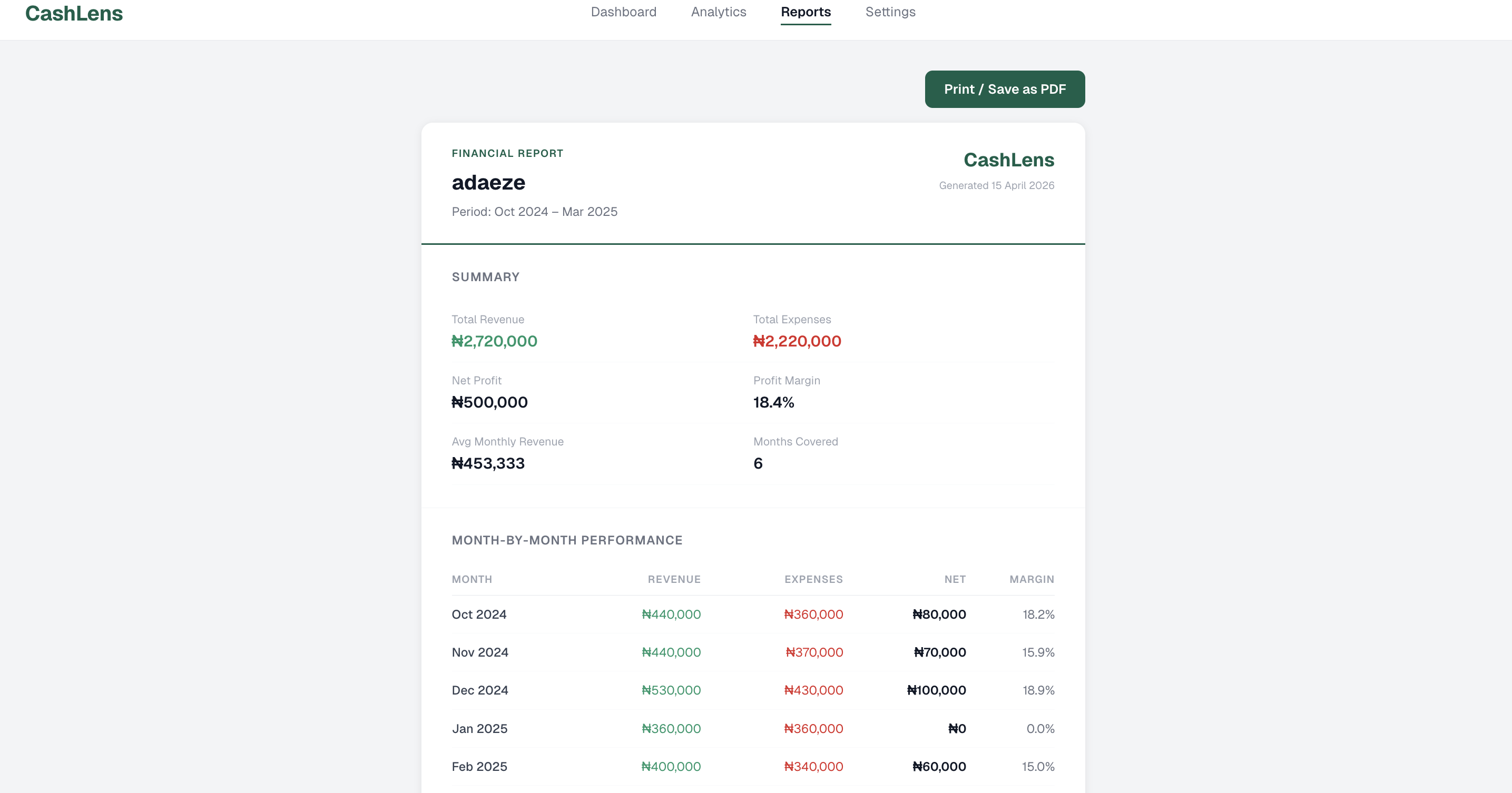 CashLens transforms raw transaction data into a structured financial profile for small businesses.