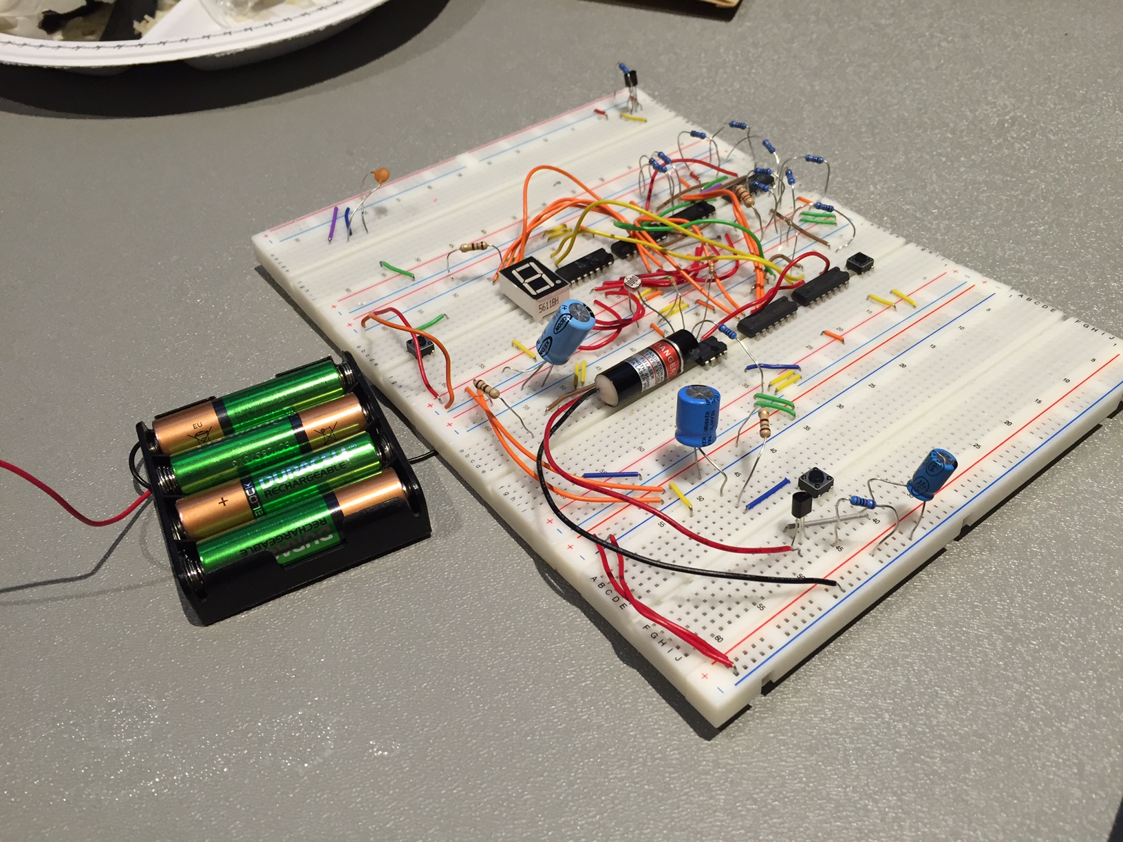 There are two components: the laser and life counter. The laser part is rather simplistic, with an RC circuit, going to a switch and transistor to turn on the laser for a small amount of time. Thus, this limits the user to only fire once, then having to wait to recharge. It wouldn't be fun to be able to shoot continuously, though for demonstration reasons, I changed the value of the resistor to allow faster recharge times to quickly show how it works. To then record hits, there is a light dependent resistor that triggers a down-counter when the laser hits it. By using a 74HCT4511 binary coded decimal to 7 segment display, the current amount of lives would be displayed. Inverters were used to flip the output of the 74HCT4511 to create the correct output on the display. Some additional control logic was used to stop the counter from underflowing past 0, and so no matter how many additional times the user is shot, the counter will not go back to 9. Since binary coded decimal can only display up to 9, that is why that is the max amount of lives. A reset button is also required, which presets the counter back to 9, to avoid issues with undesired states and also when powered on there are bouncing issues that cannot be eliminated, other than using the reset button.