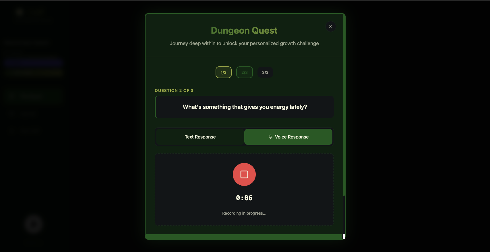 We built a basic trait leveling system, voice-to-text input, and quest generation pipeline, all within a mobile-first design layout.