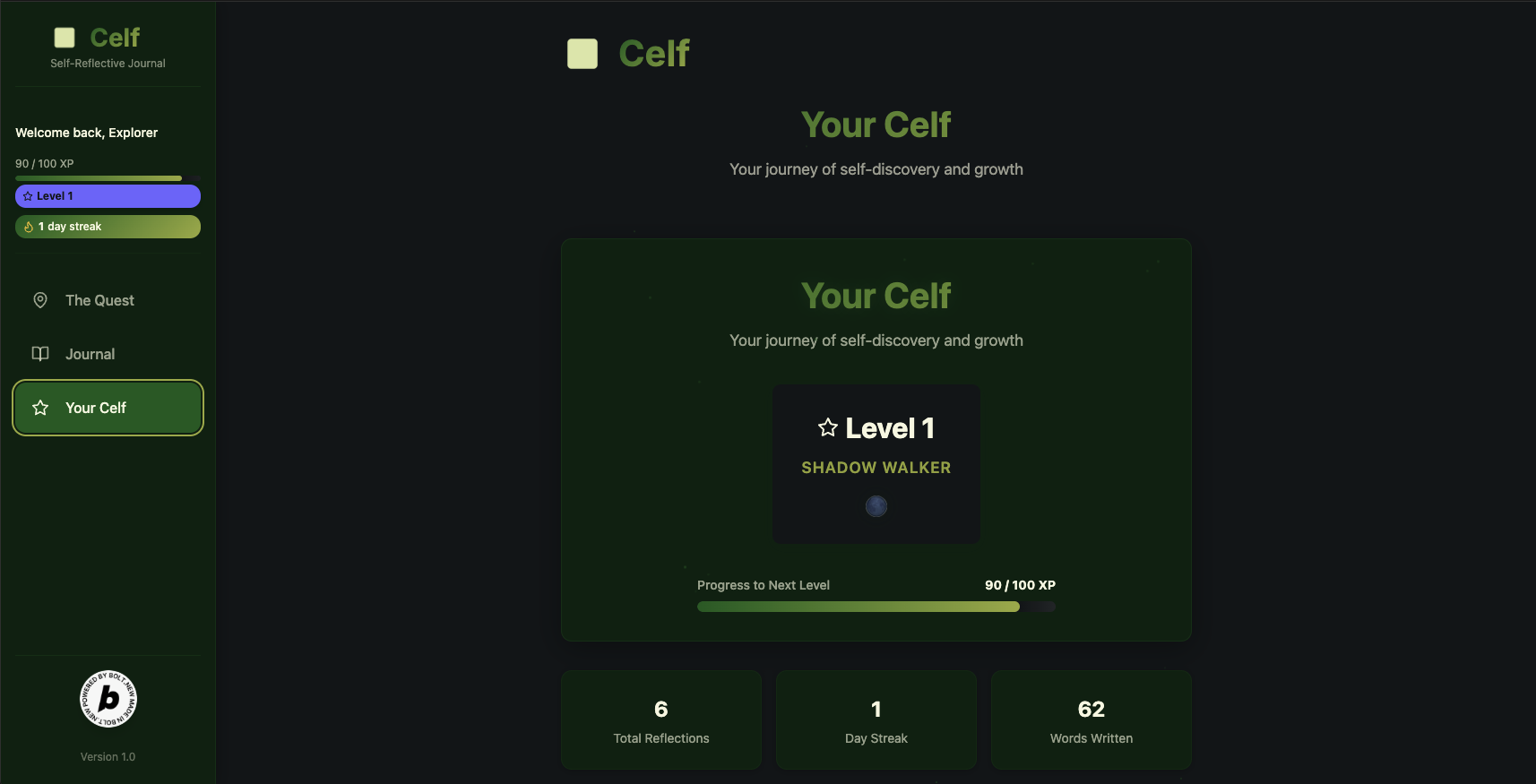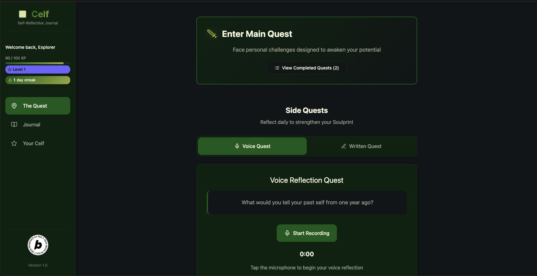 Celf is a voice-powered self-growth app. Users speak or type journal entries, and the app turns those reflections into meaningful prompts and quests. Over time, users develop traits like clarity, grit, and willpower through small, consistent actions—tracked as XP.