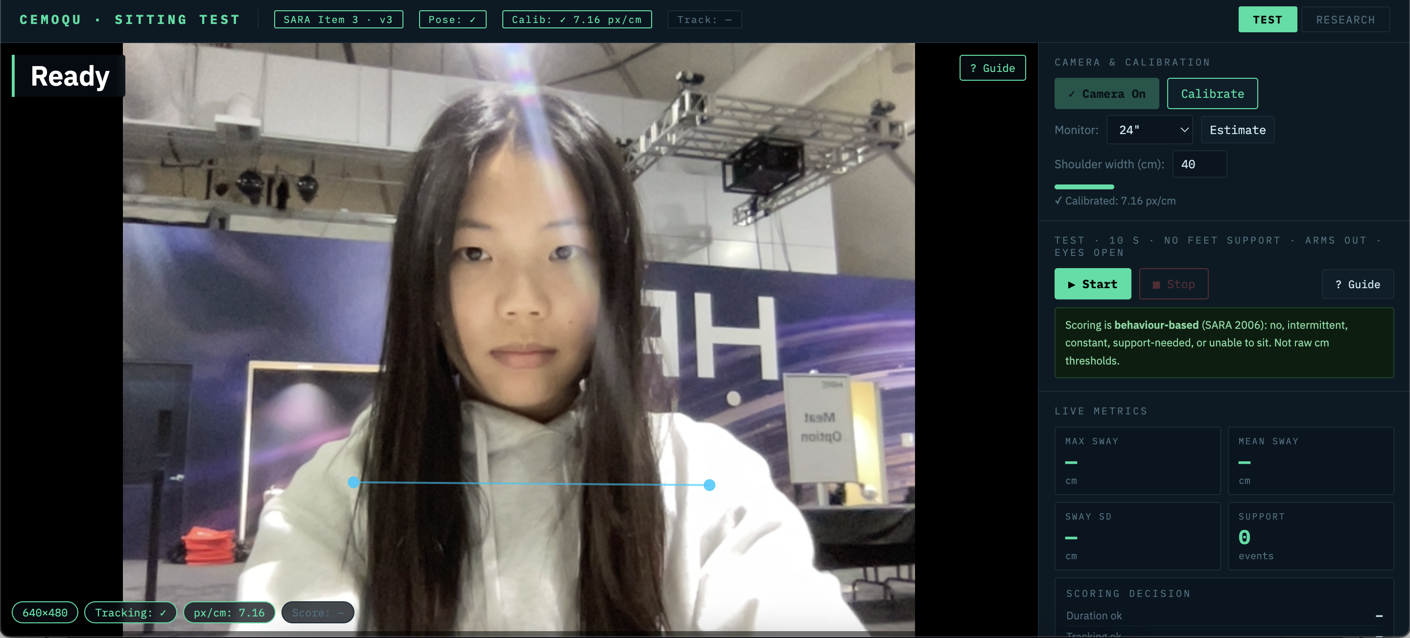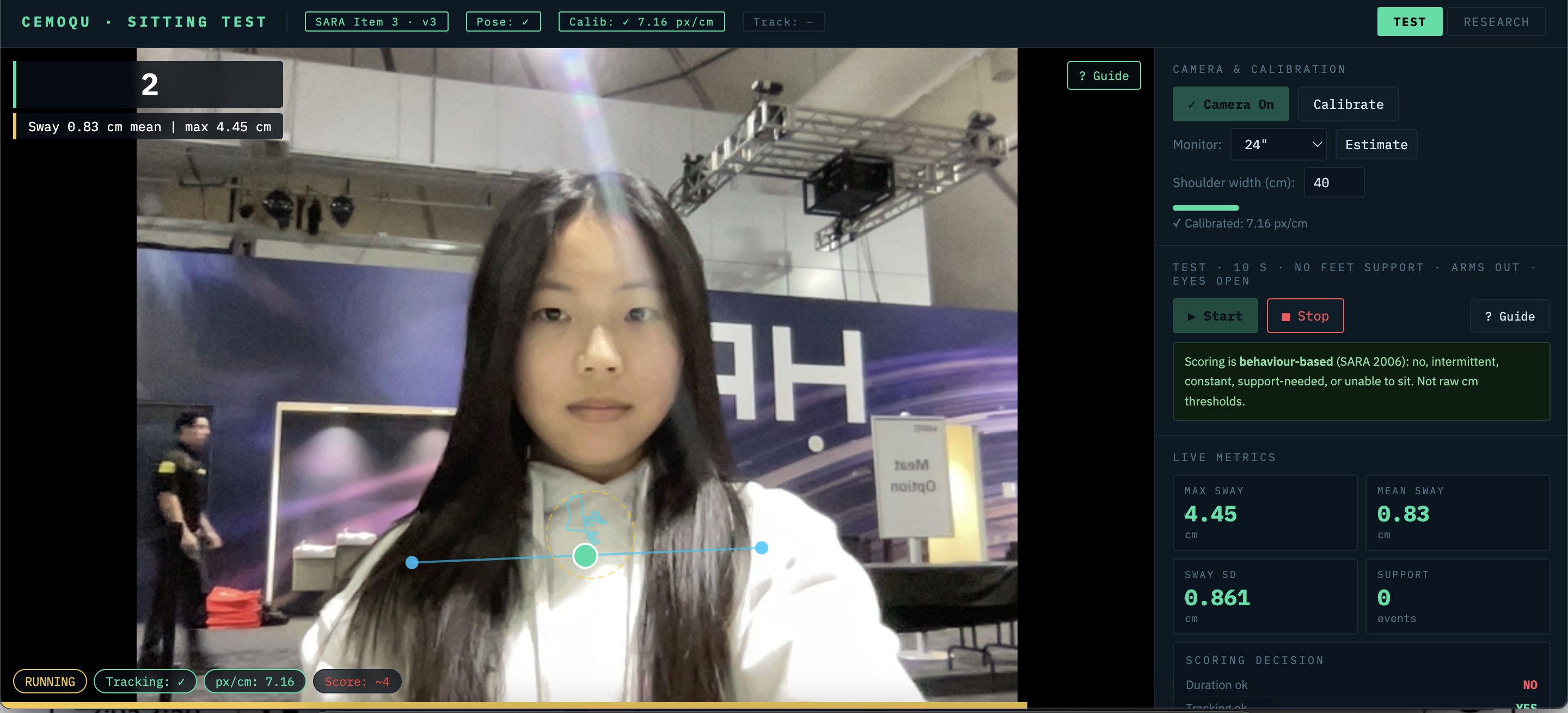 This made me realize that a key limitation in current clinical practice is not the lack of diagnostic tools, but the lack of frequent, accessible, and objective monitoring between visits. CeMoQu was created to address this gap by digitizing a core component of the SARA neurological assessment and making it usable from anywhere with a webcam.