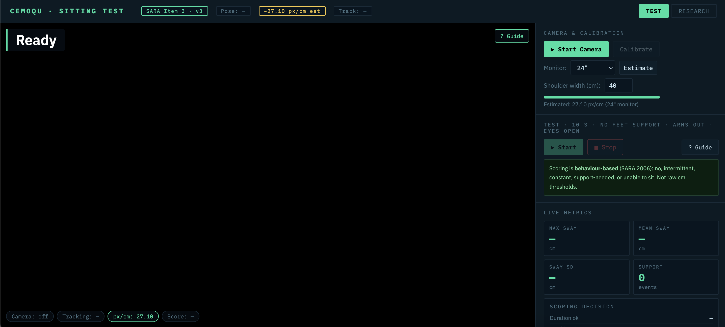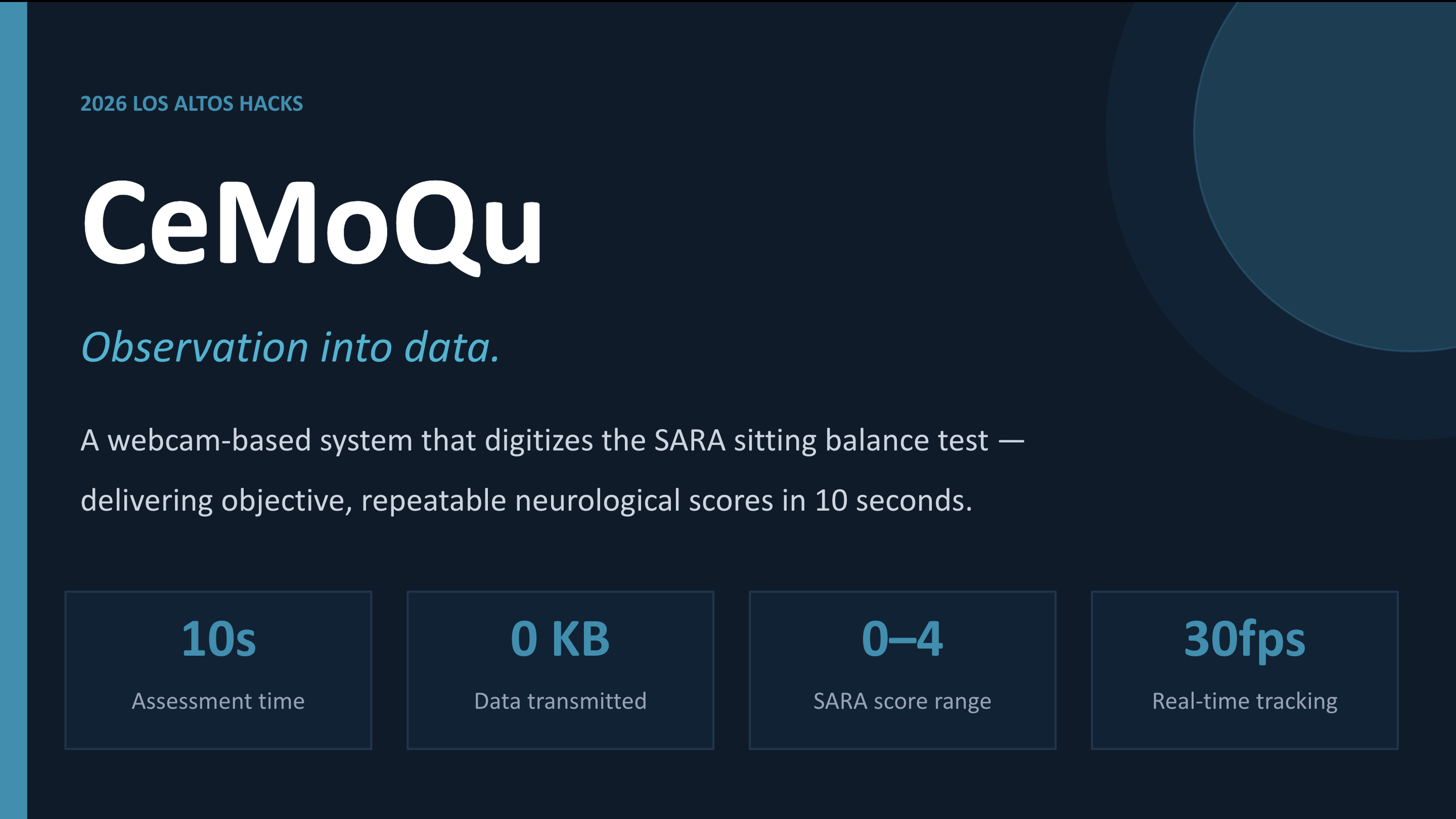 CeMoQu is a zero-install, browser-native clinical decision-support tool that automates the SARA (Scale for the Assessment and Rating of Ataxia) sitting balance test using on-device AI.