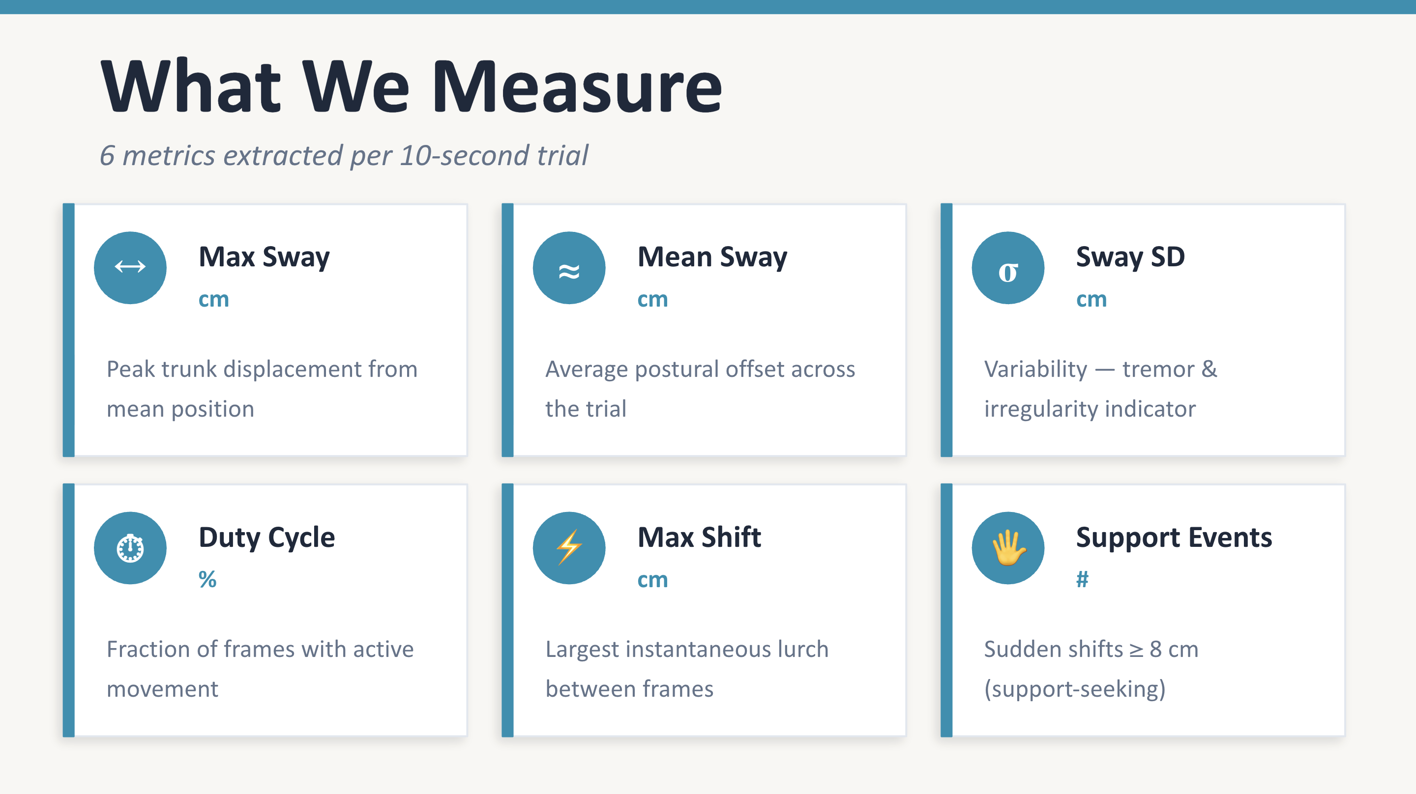 - Converts pixel-level motion into calibrated centimeter-scale sway metrics (max displacement, RMS, sway duty cycle, inter-frame velocity)