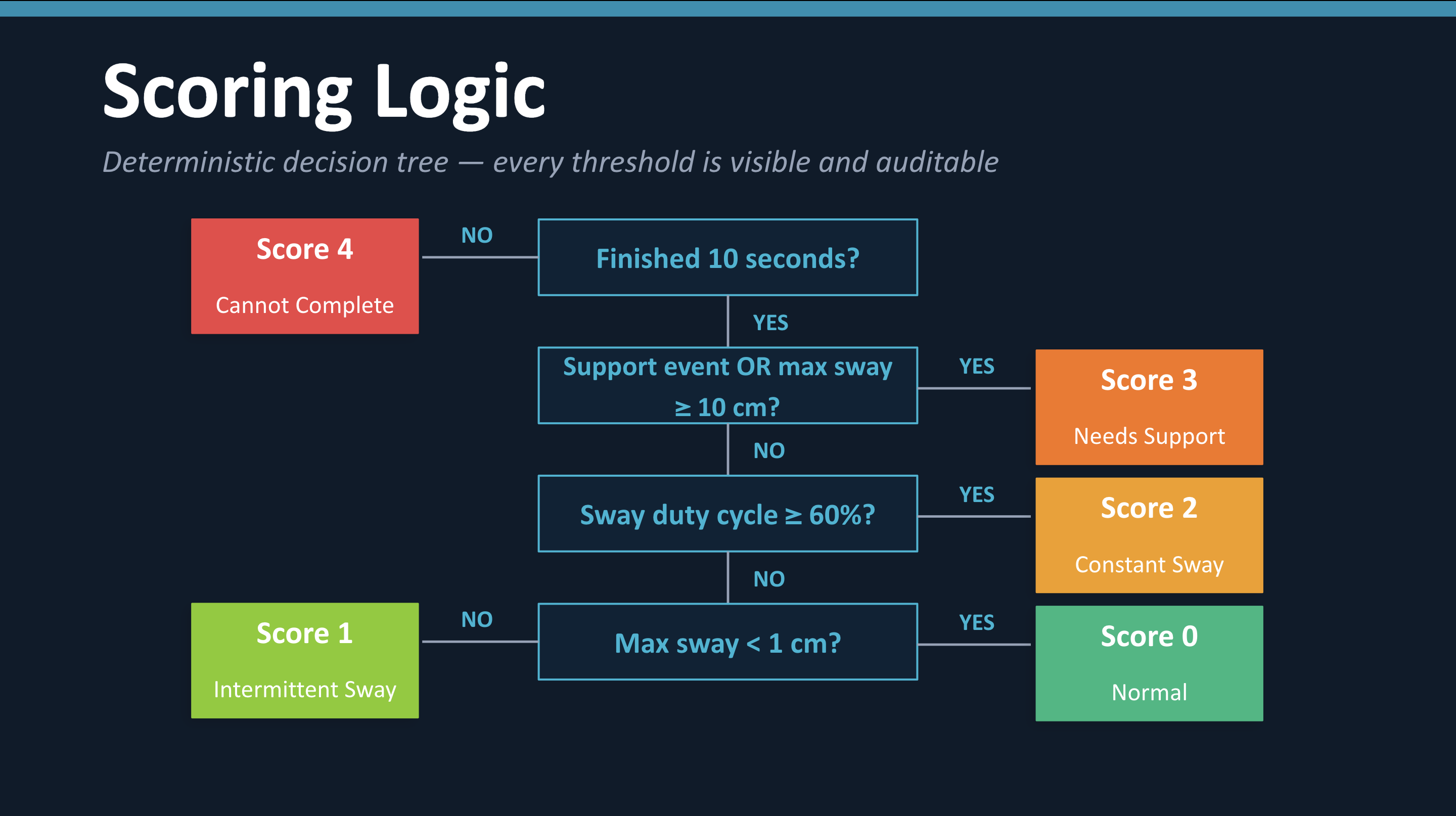 Rather than threshold-based approximations, the scoring logic is a deterministic decision tree faithfully implementing the clinical rubric — distinguishing intermittent vs. constant sway, detecting support events via single-frame velocity spikes (≥ 8 cm), and handling tracking loss gracefully.