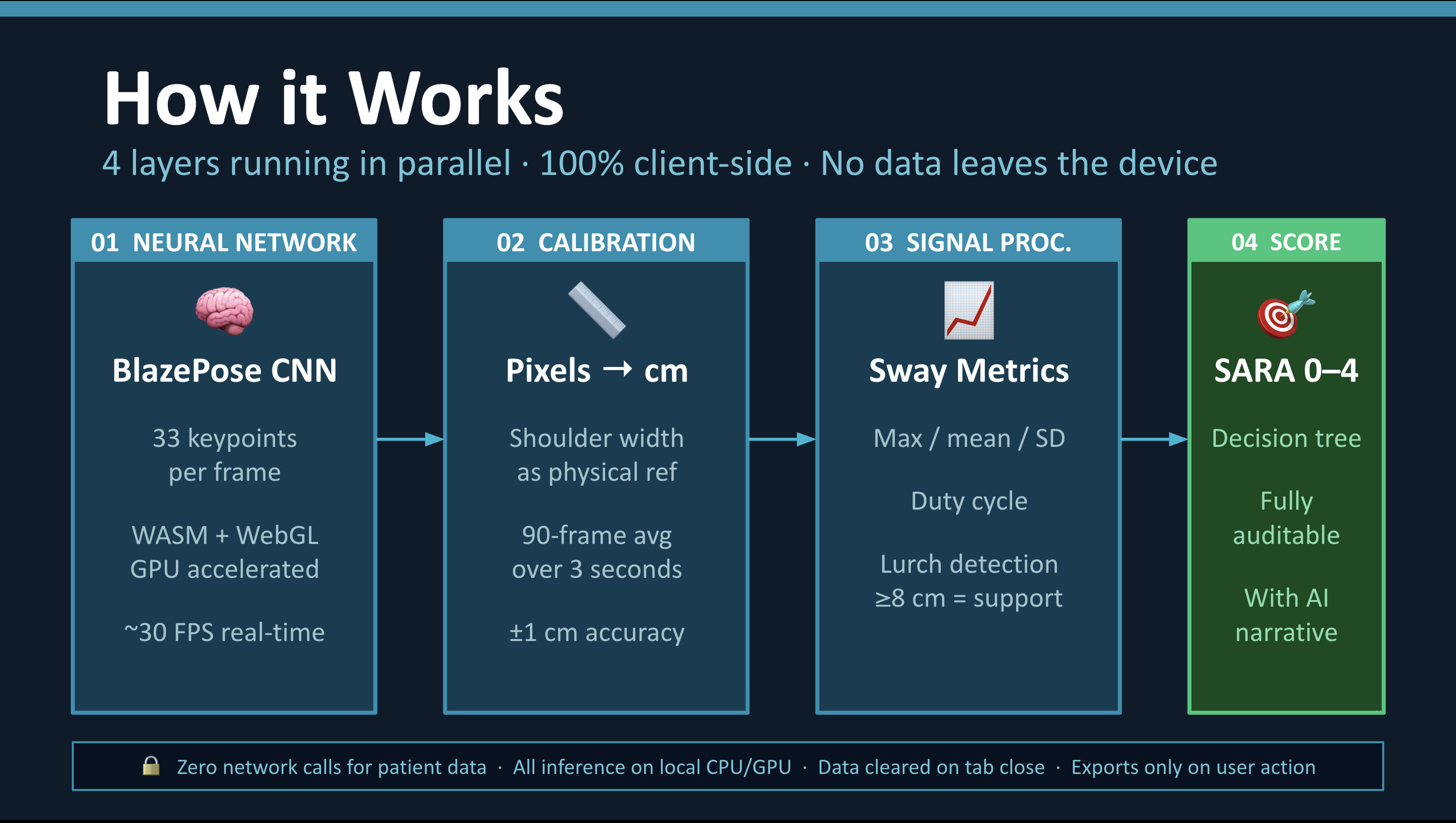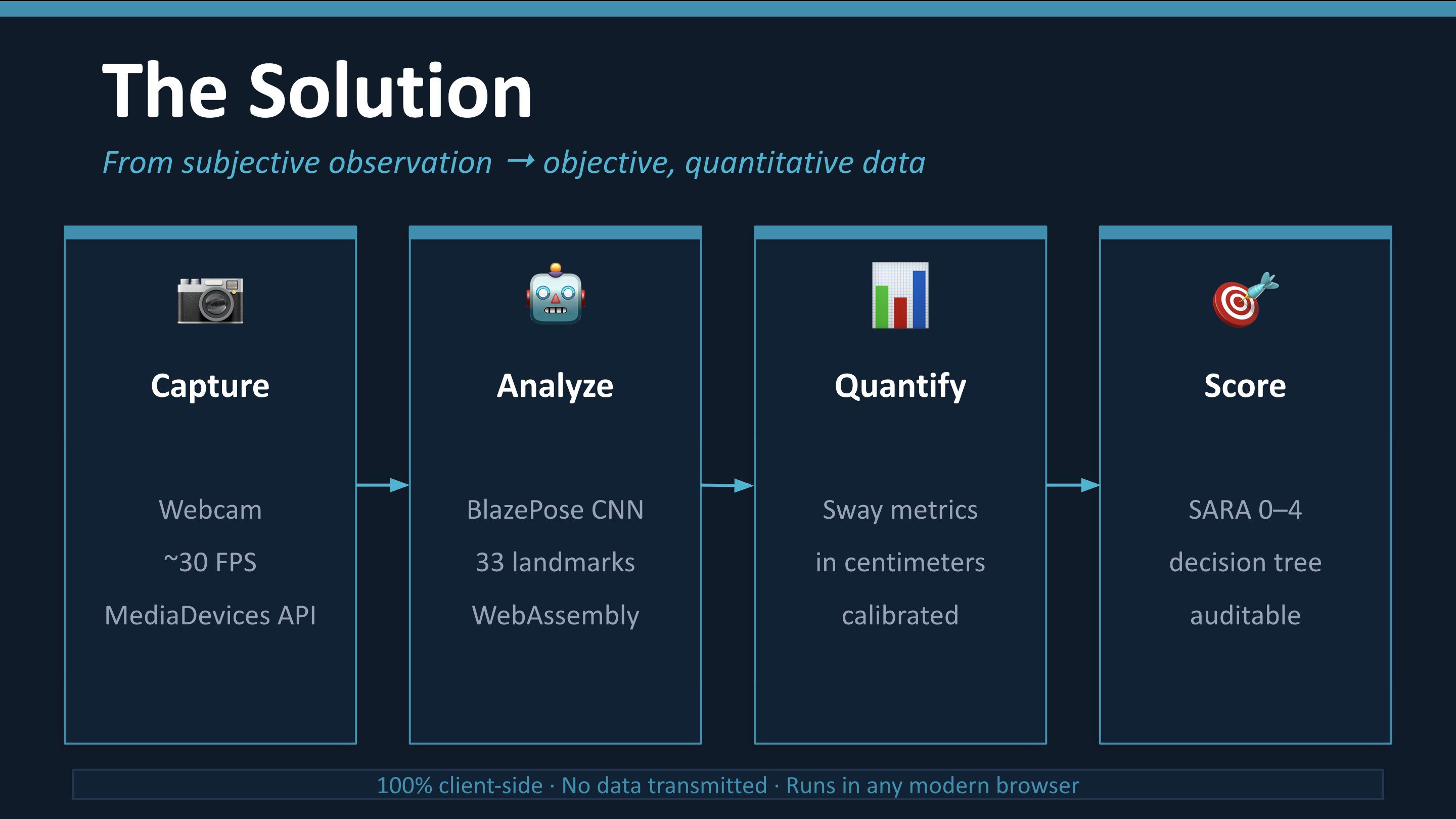 Encoding clinical judgment in code. SARA scoring isn't a simple lookup table. It relies on qualitative distinctions (intermittent vs. constant, needing support vs. not) that required careful translation into deterministic, auditable logic without losing clinical fidelity.