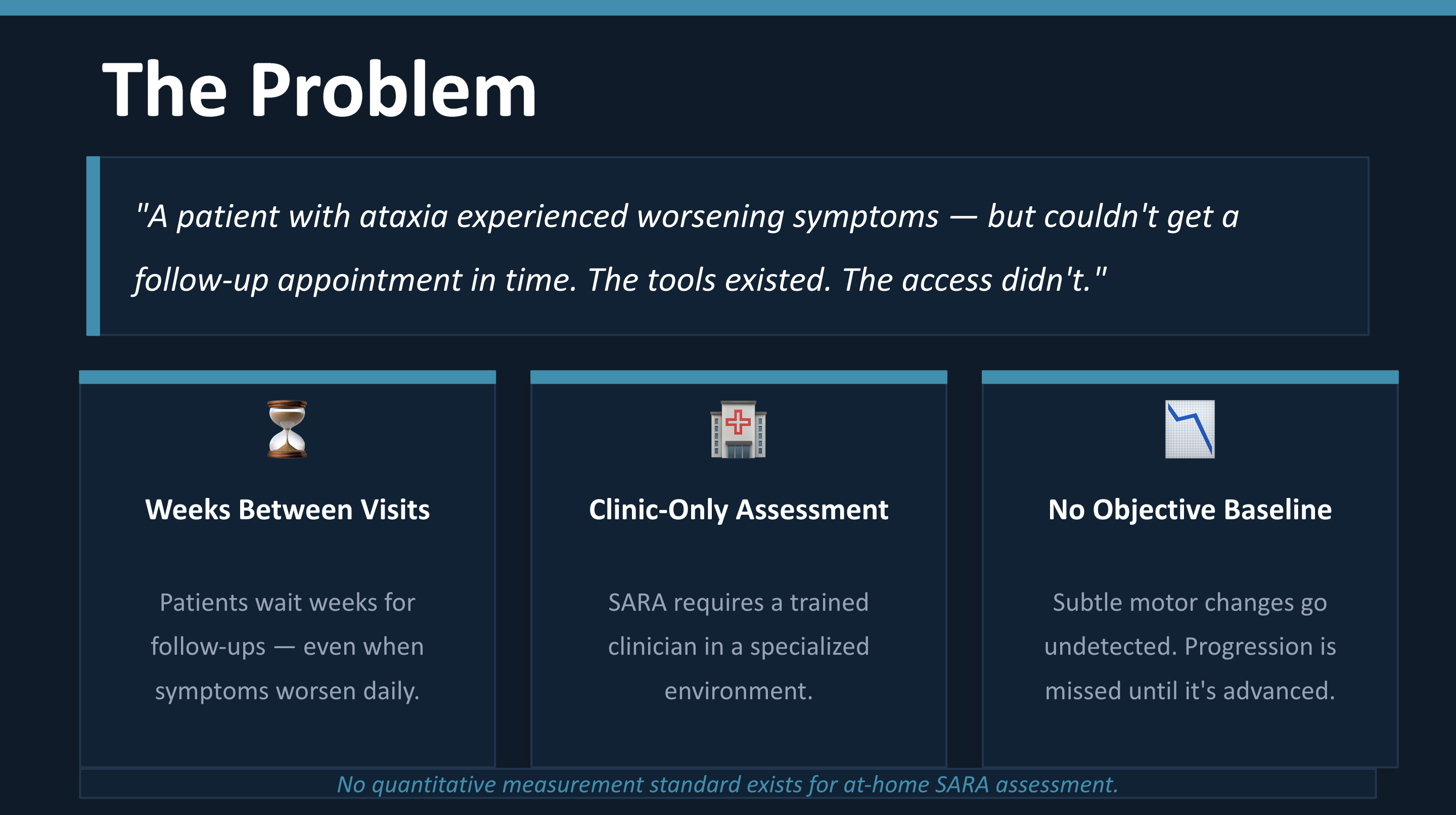 CeMoQu (Cerebellum Motion Quantitative) was inspired by a real-world story about a patient with ataxia who experienced worsening symptoms while waiting for a follow-up clinical appointment that could not be scheduled in time. This highlighted a critical gap in neurological care: patients with progressive conditions often go weeks or months without objective reassessment, even though subtle changes in motor function may occur much earlier.
