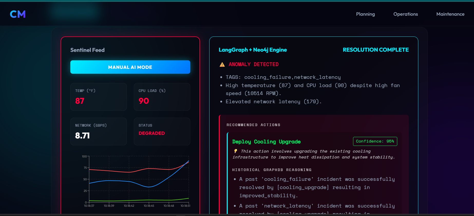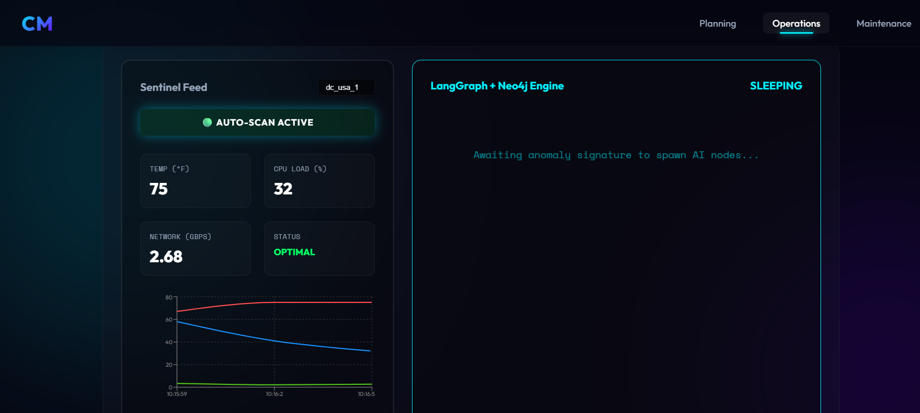 - Operations Agent continuously monitors data centers, detects anomalies, auto-diagnoses against historical patterns, and renders live chart visualizations with metrics (Temperature, CPU load, Network bandwidth) that update every 3 seconds based on real-time data pulled from the Redis memory.