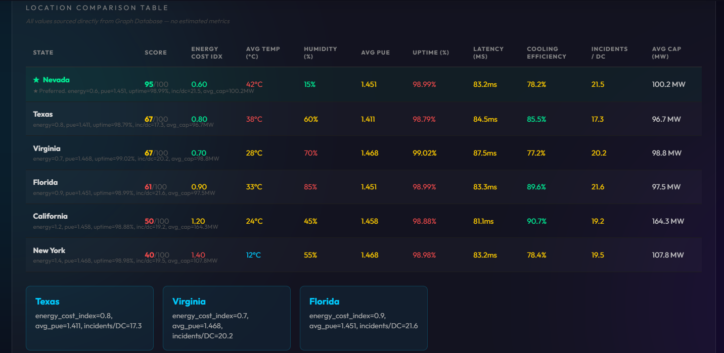 Planning Agent - Recommended New Data Center Location and Metrics