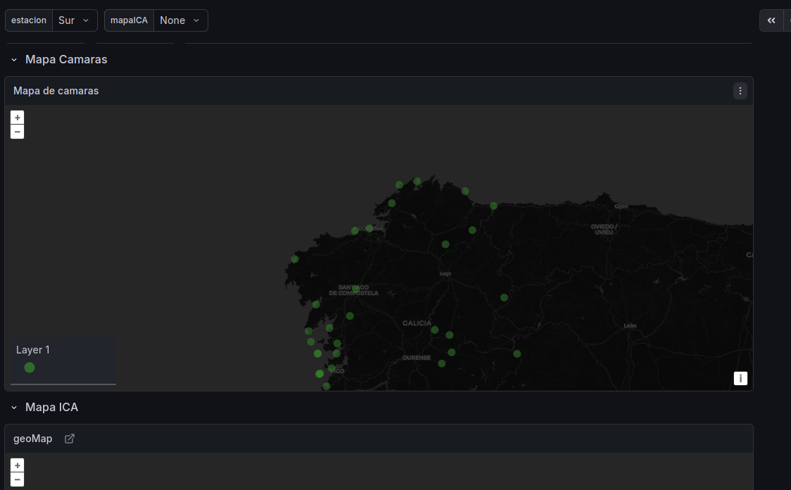 Para la parte gráfica de paneles usamos Grafana por su facilidad para crear paneles visuales y faciles de comprender. La combinamos con la base de datos InfluxBD, para poder manejar series temporales, un imprescindible en climatología y previsiones ambientales.