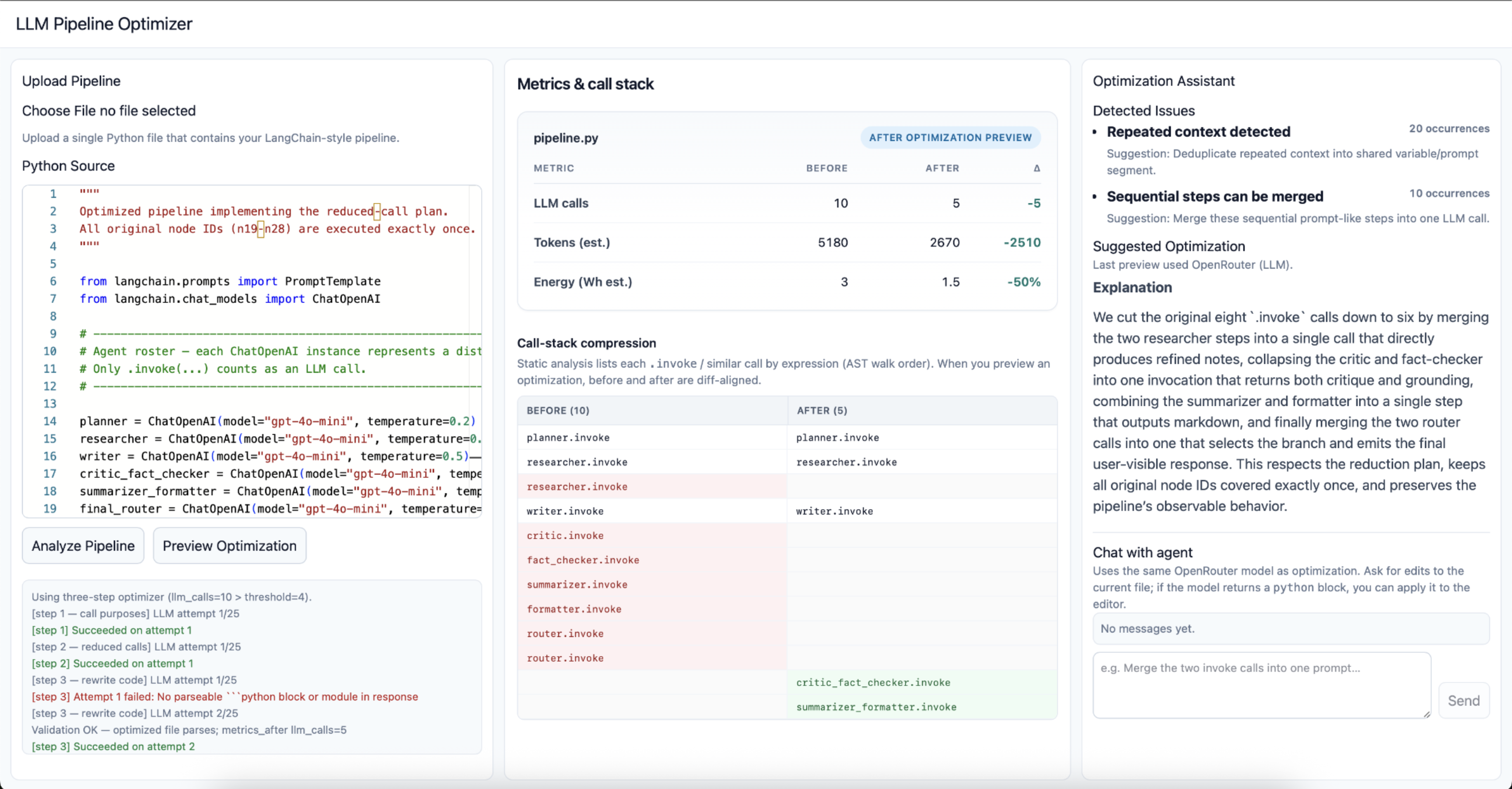 - Display before/after metrics, including call count, token estimates, and energy usage The result is a streamlined pipeline that performs the same task with significantly fewer LLM calls. This leads to lower cost, faster return time, and above all, less environmental waste due to energy usage.
