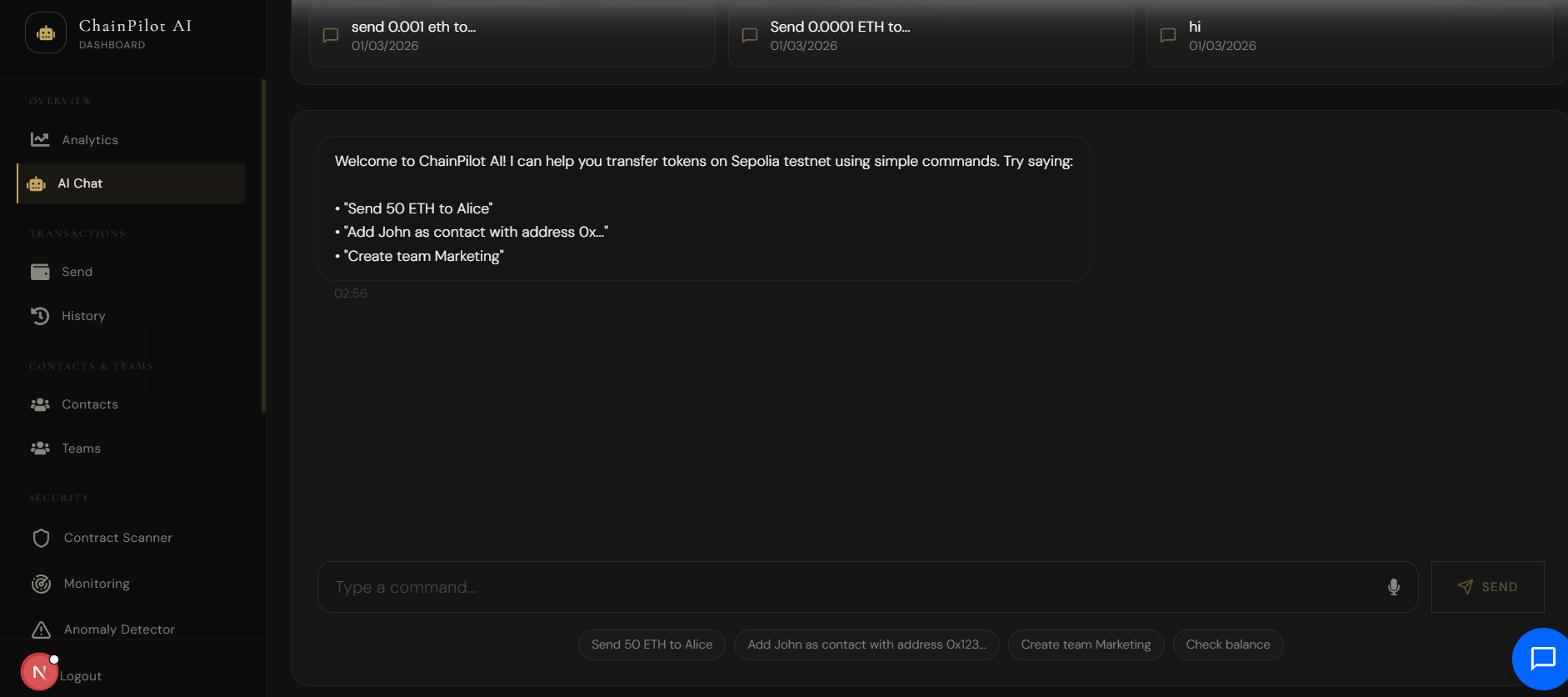Control your wallet using natural language to send funds, manage contacts, and teams.