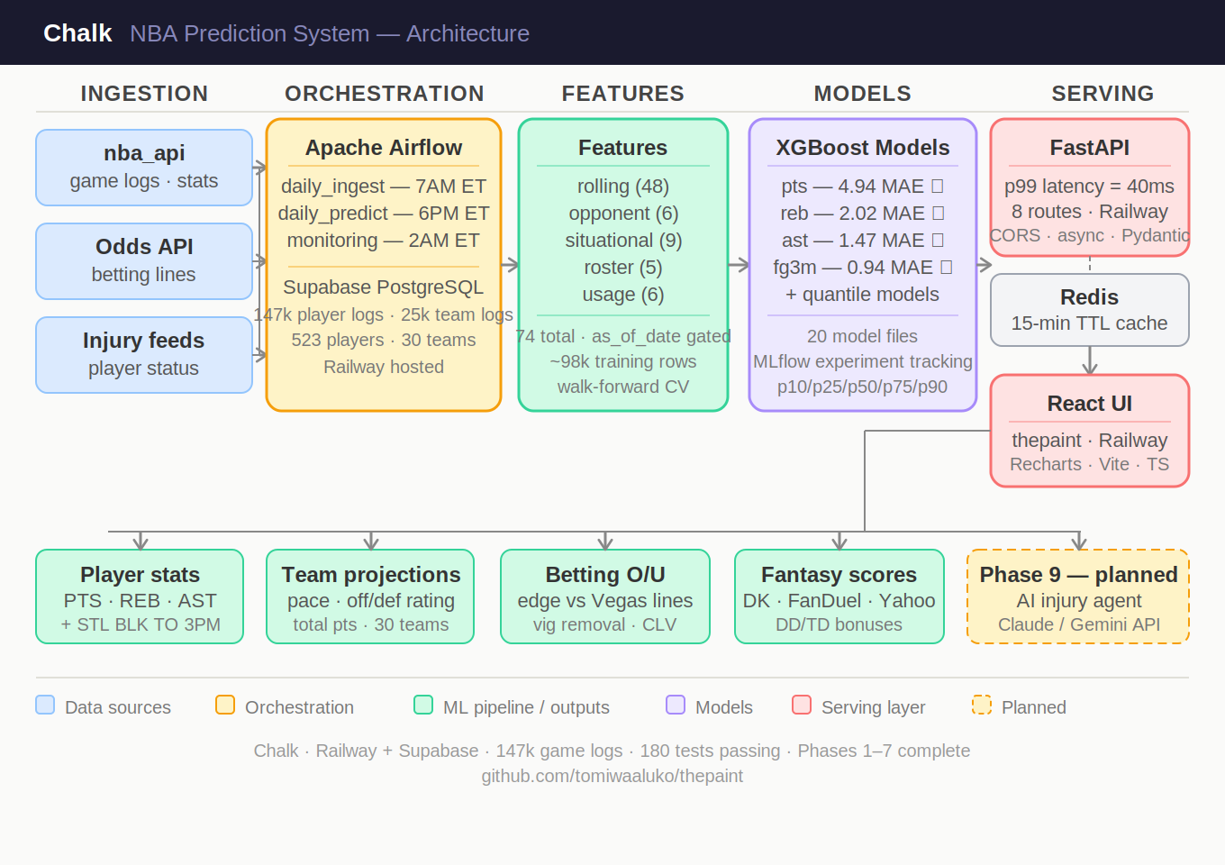 Chalk predicts NBA statlines at both the player and team level. It produces: