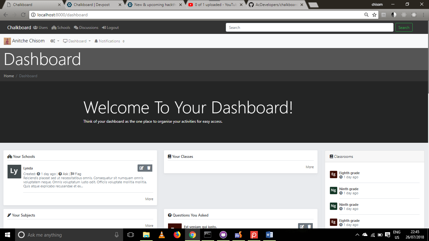If I was to write a book on my journey of learning programming and was later asked to build an application referencing the book to include all the key components from the various platforms that helped me to provide a better experience for those who follow the same path, Chalkboard will be the result of that project. Great platforms like Lynda.com, php.net and Laracast.com to name a few offered me the resources I need to learn programming, so I tried as much as could to incorporate them into one application (Chalkboard) and with a few of my own ideas to cement the blocks together.