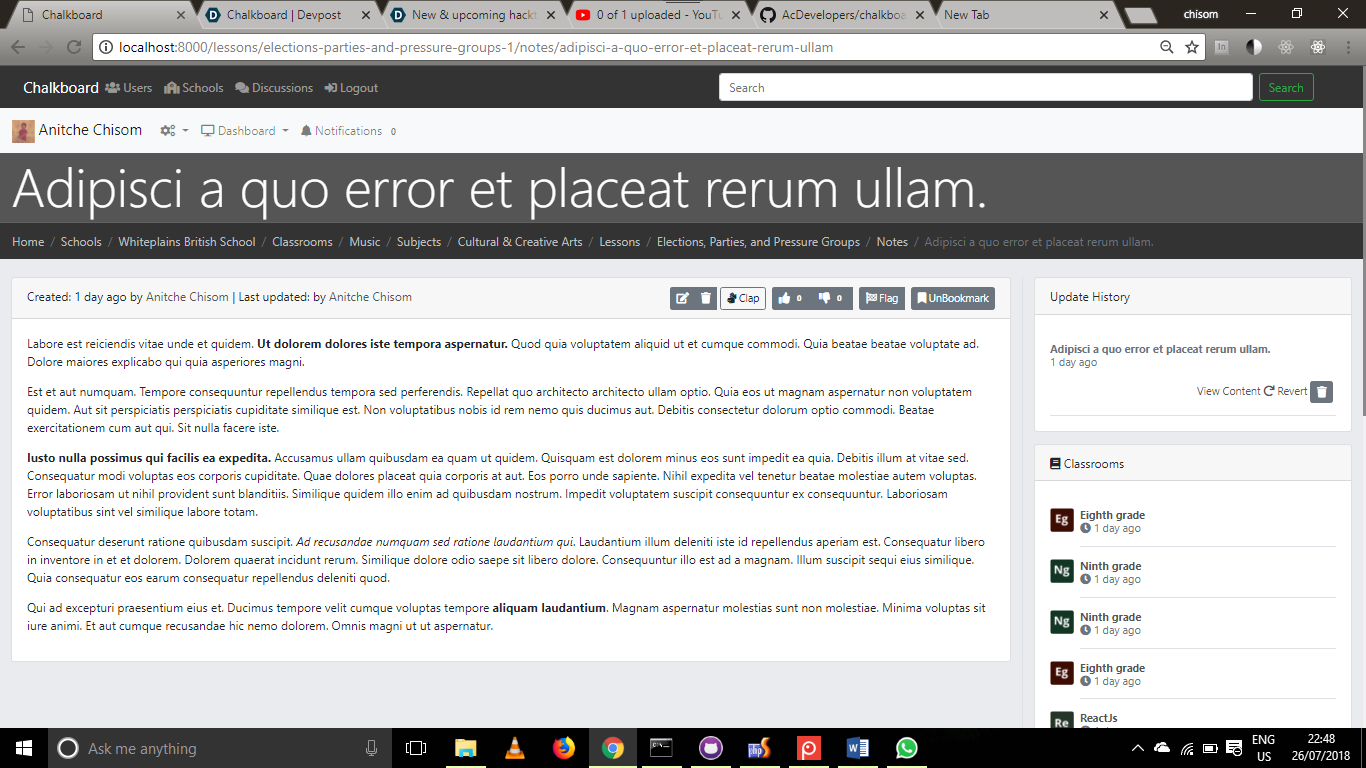 Chalkboard is similar to most existing platforms out there but it is unique in the sense that it allows Moderators or Content Managers to create series of follow-up videos in one lesson to tackle minor issues that naturally would be tagged “Beyond the scope of this lesson” or shipped out as a separate package which might be named something a beginner won’t easily find (and that is assuming they know to look for it). It also features notes which allows the members to leave opinions on a lesson (Just like the php.net documentation section). These opinions can be modified but like a wiki, the owner or the creator of the note can decide if to go with it or revert to the previous version. To spice things up Chalkboard has a Coin feature to reward users for their contributions to the network. Claps, thumbs up and down feature also included. Conduct quiz on each lesson to gage how much the user learned. The school entity can be hooked to a Facebook Page to provide a better social experience if one exist.