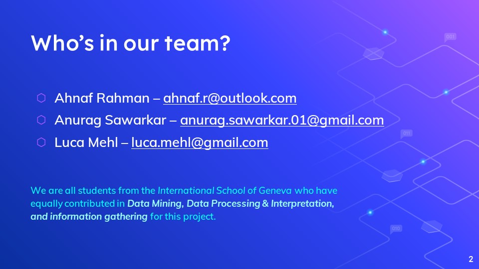 Our team is composed of Luca Mehl, Anurag Sawarkar, and Ahnaf Rahman. We’re all high school students attending the international school of Geneva.