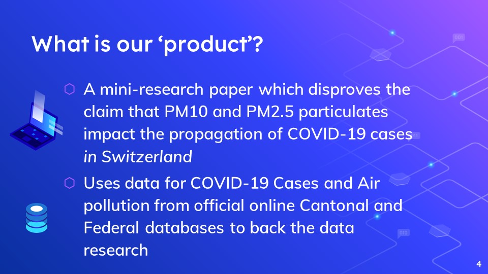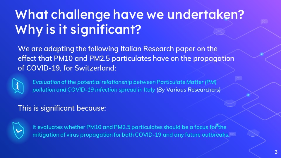 We chose to undertake challenge number 187 - COVID-19 and Air pollution, attempting to find whether or not Particulate Matter of coarseness 10 and 2.5, (also known as PM10 and PM2.5 levels) have any effect on the prevalence and severity of COVID-19 cases across switzerland.
