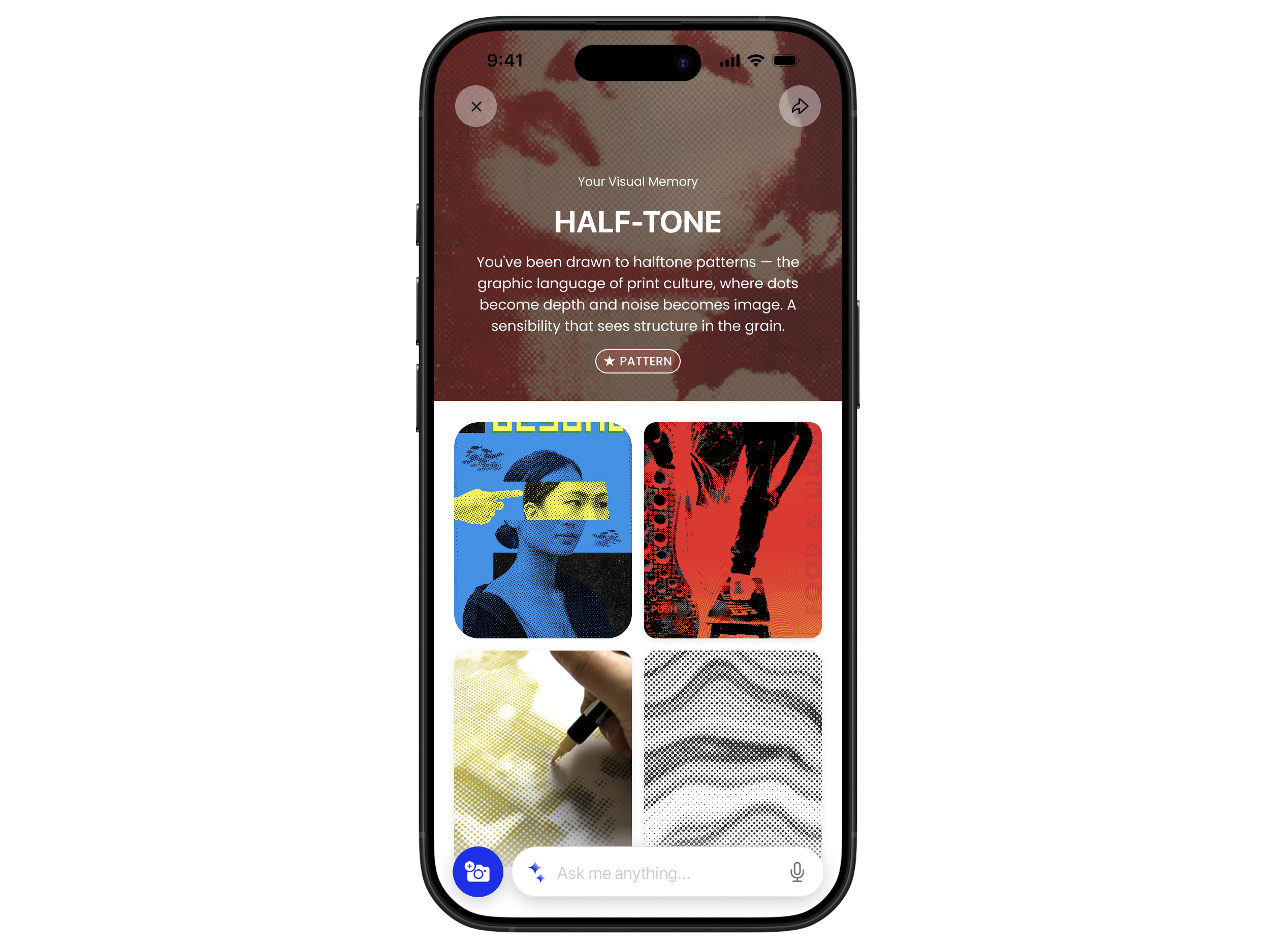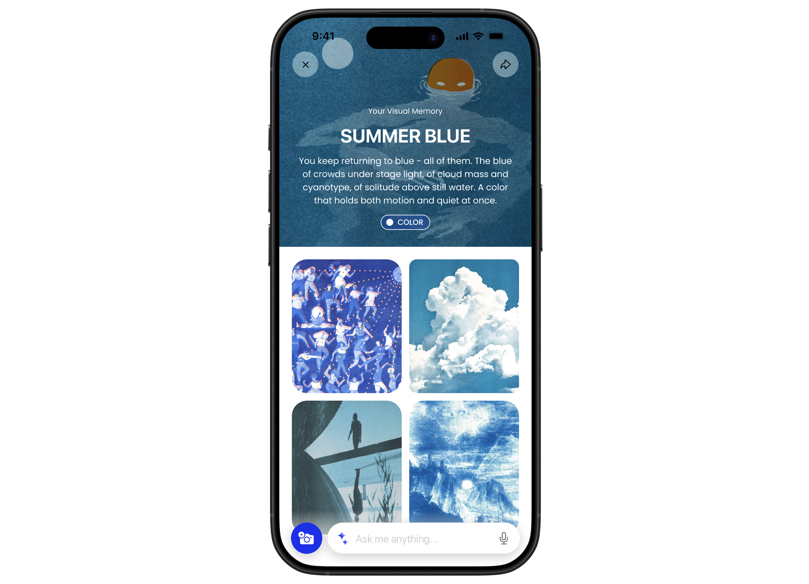 The memory feature we designed is just a prototype. We think there is so much potential for a smart, moodboard-like memory system that functions as a living aesthetic gallery, one that grows more precise, personal, and shareable with every image collected. As users snap more, the pattern recognition will deepen, moving from broad themes like color and texture toward more nuanced signatures of personal taste.