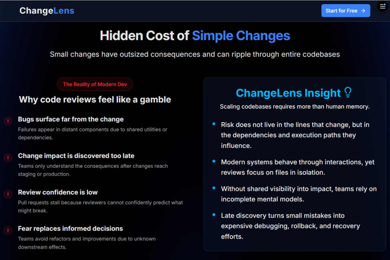 - ChangeLens was inspired the need for system-wide visibility into change impact before merge, not after something breaks in production.
