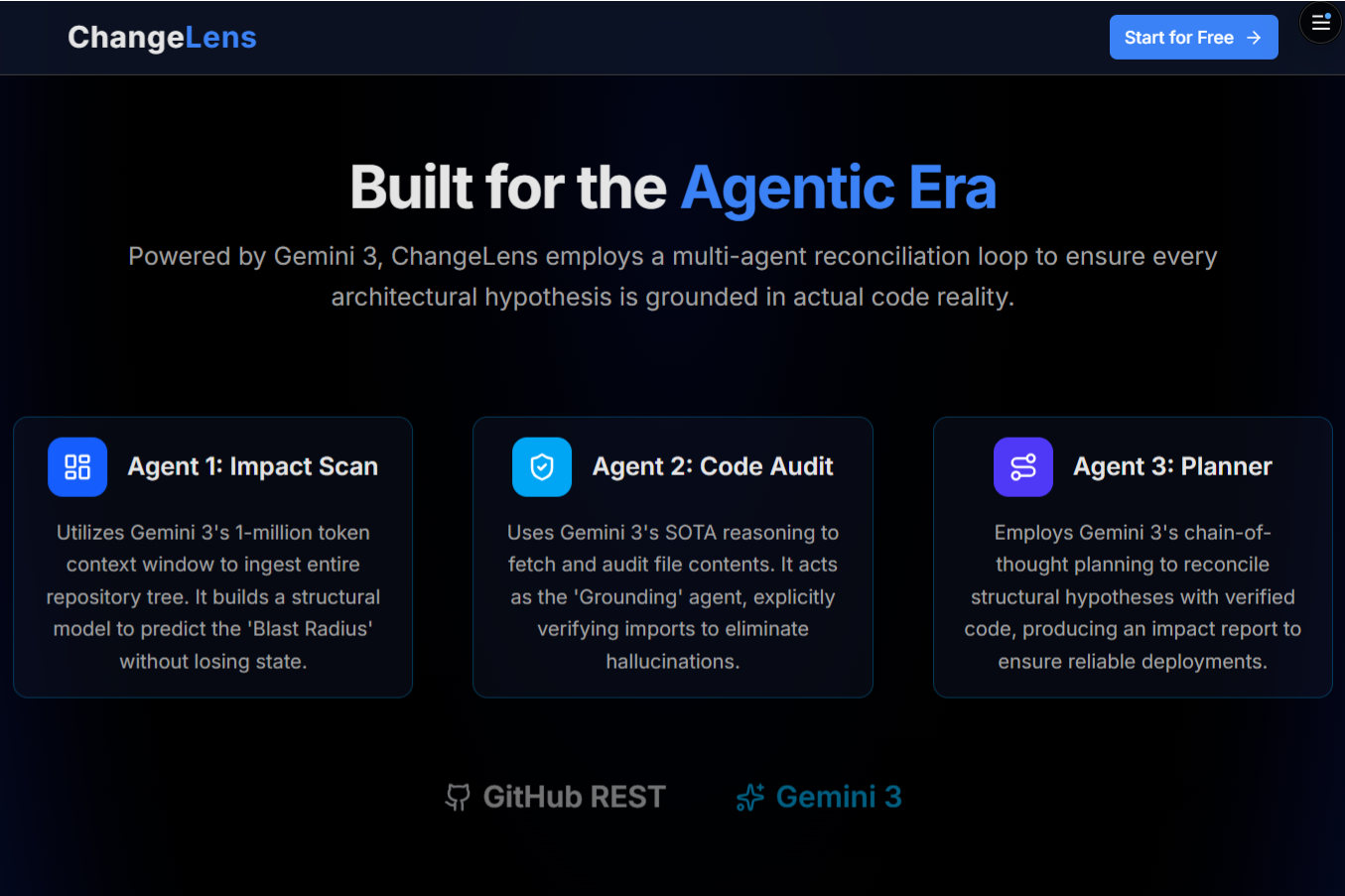 ChangeLens is built around a three-agent reasoning architecture. At the core of the system is Gemini 3 Flash, chosen for its ability to reason over large codebases using its 1M-token context window, strong coding benchmark performance, and low latency.