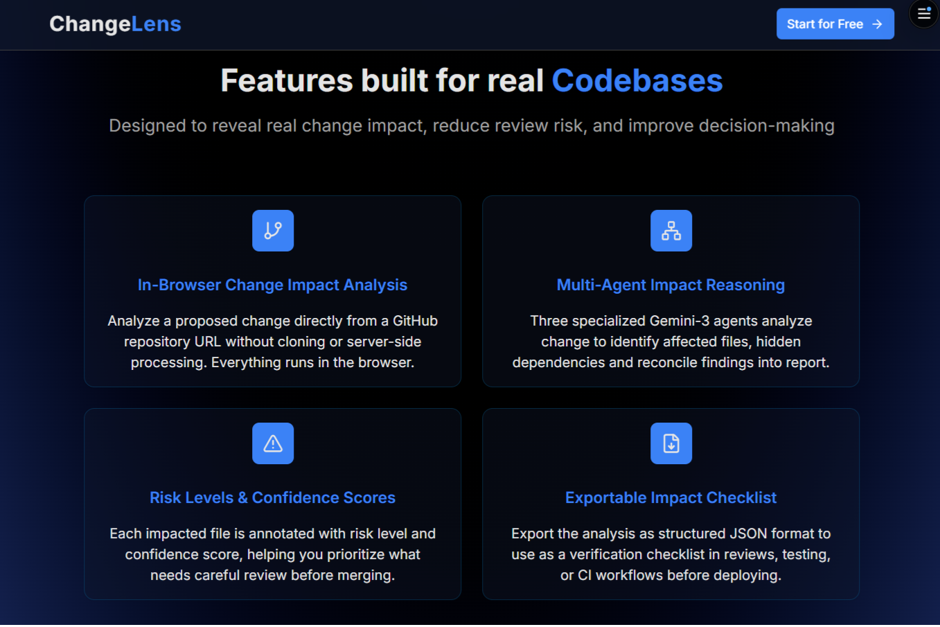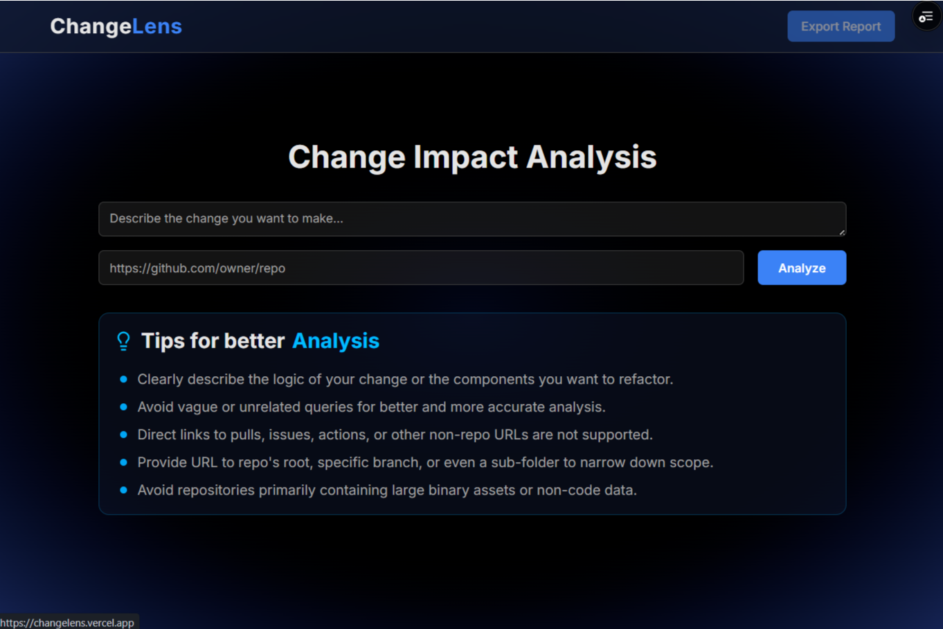 ChangeLens analyzes a proposed code change and predicts its blast radius across a GitHub repository before the change is merged. Given a change request and a repository URL, ChangeLens: