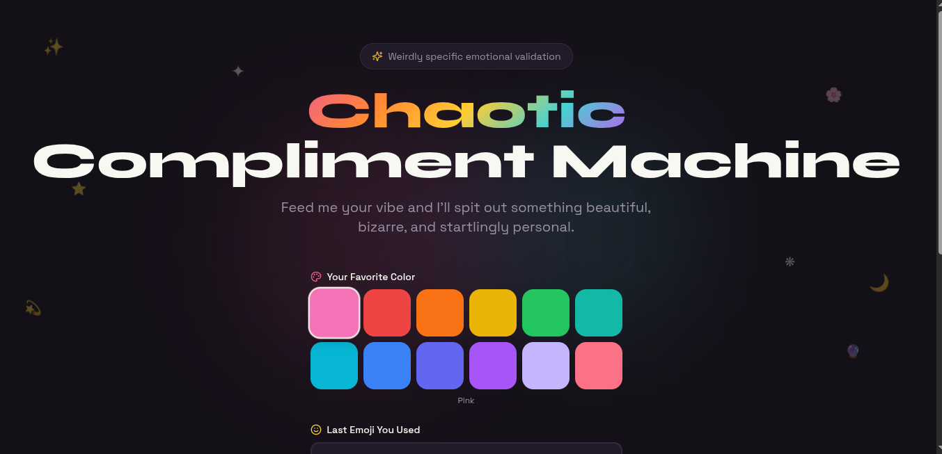 The Chaotic Compliment Machine takes seemingly meaningless data points your favorite color, the last emoji you used, current time and transforms them into compliments that are simultaneously absurd and strangely heartfelt. It's not trying to flatter you. It's not generating generic praise. Instead, it finds the hidden poetry in randomness and reflects it back as a compliment that feels both chaotic and deeply personal. Examples: