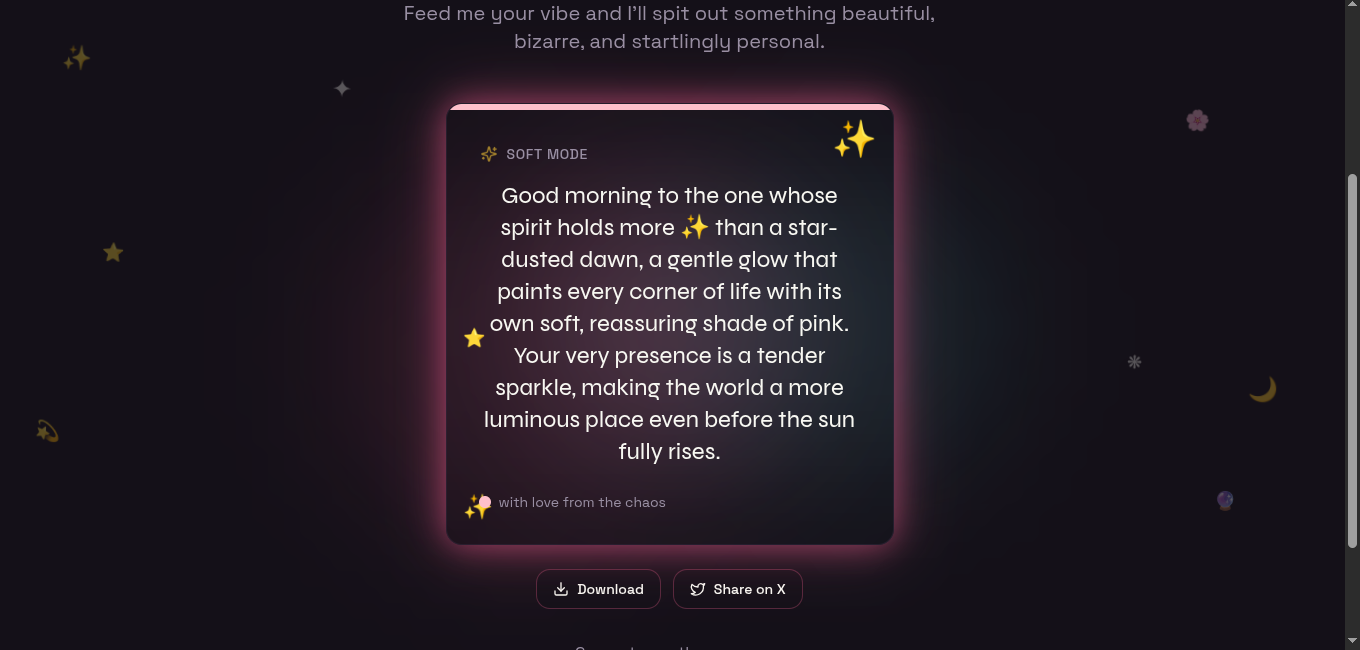 The hardest part wasn’t the code it was getting the AI to be chaotic and kind at the same time. Generic compliments are boring, and random chaos can easily turn mean or pointless. I had to keep tweaking things until I found that sweet spot where the output feels weird and playful, but still genuinely warm.