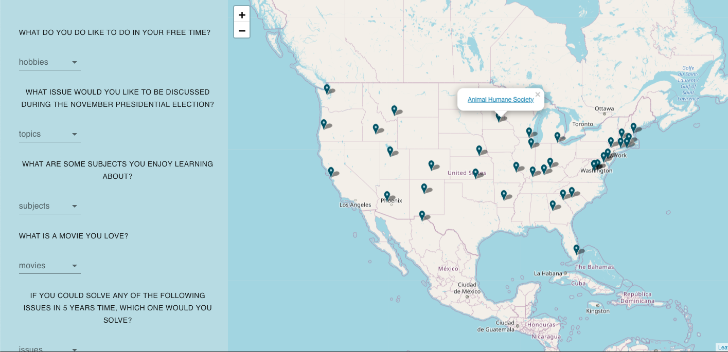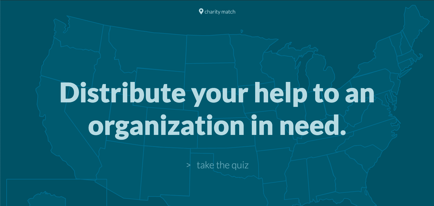 Charity Match starts with a quiz that users can take to determine what they are interested in and passionate about. We ask questions like what you do in your free time, subjects you enjoy learning about, a movie you love, and more. Through a few of these questions, we match users up with an organization in topic that they care about.