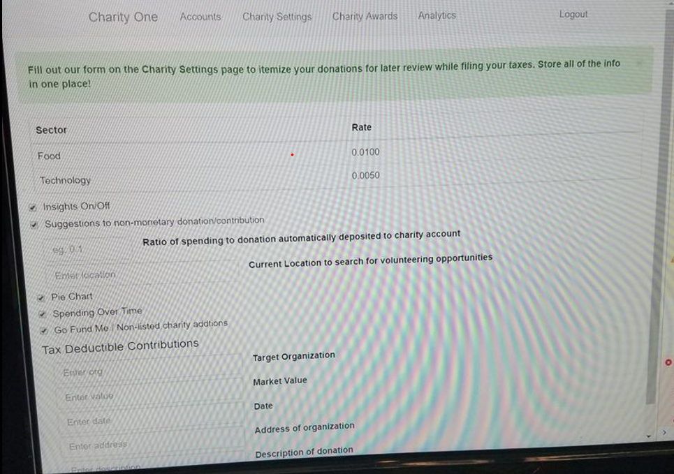 - An Analytics and Insights page that uses the user's spending habits to predict and recommend potential philanthropic opportunities. It also sets up strong visuals for the users to observe their own spending.