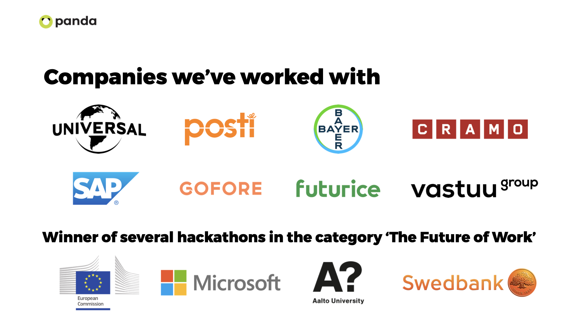 Expressed desire to pilot, looking for a project: Ramboll, Comcast, KONE, Finnair, UN, Stora Enso, S-Group, KPMG. Built chatbot product MVP. Built a podcast with following in Finland and sponsors. Built a network of freelance coaches we use for our projects.