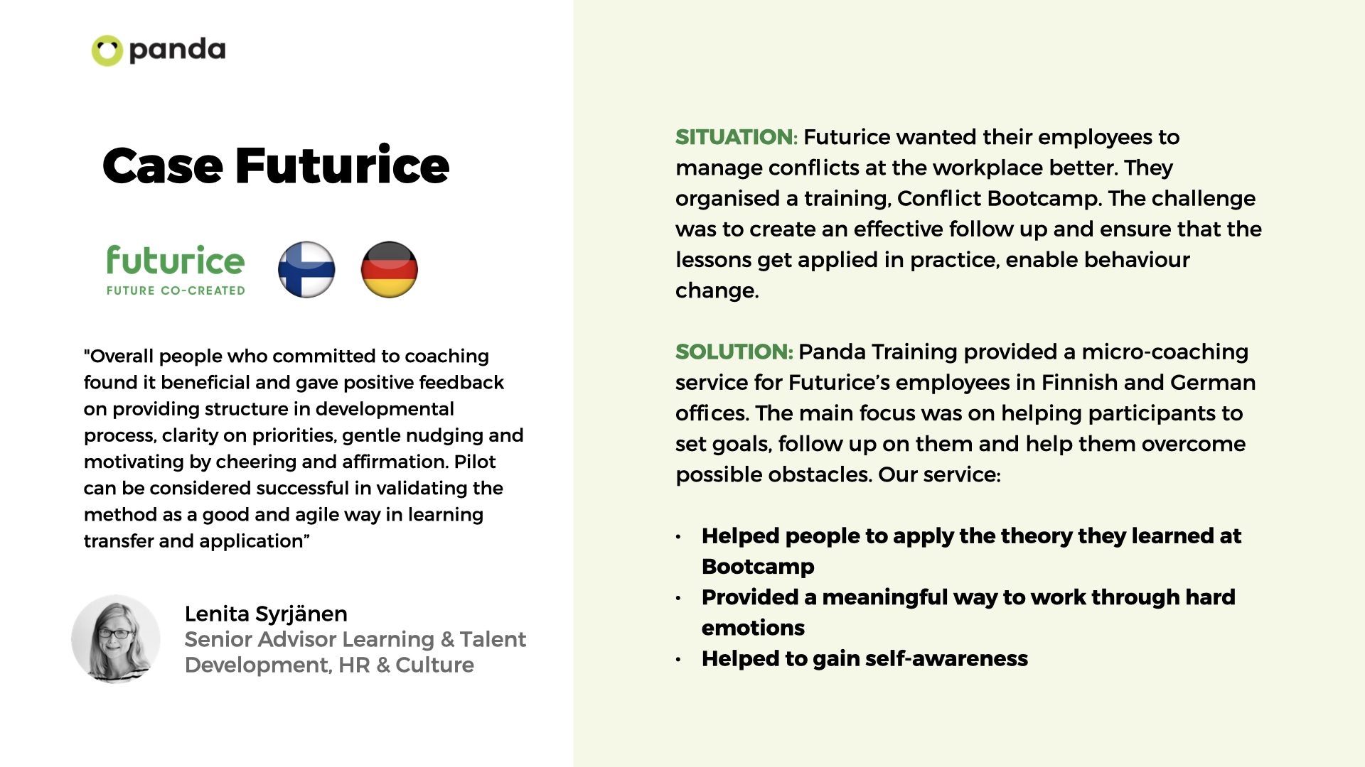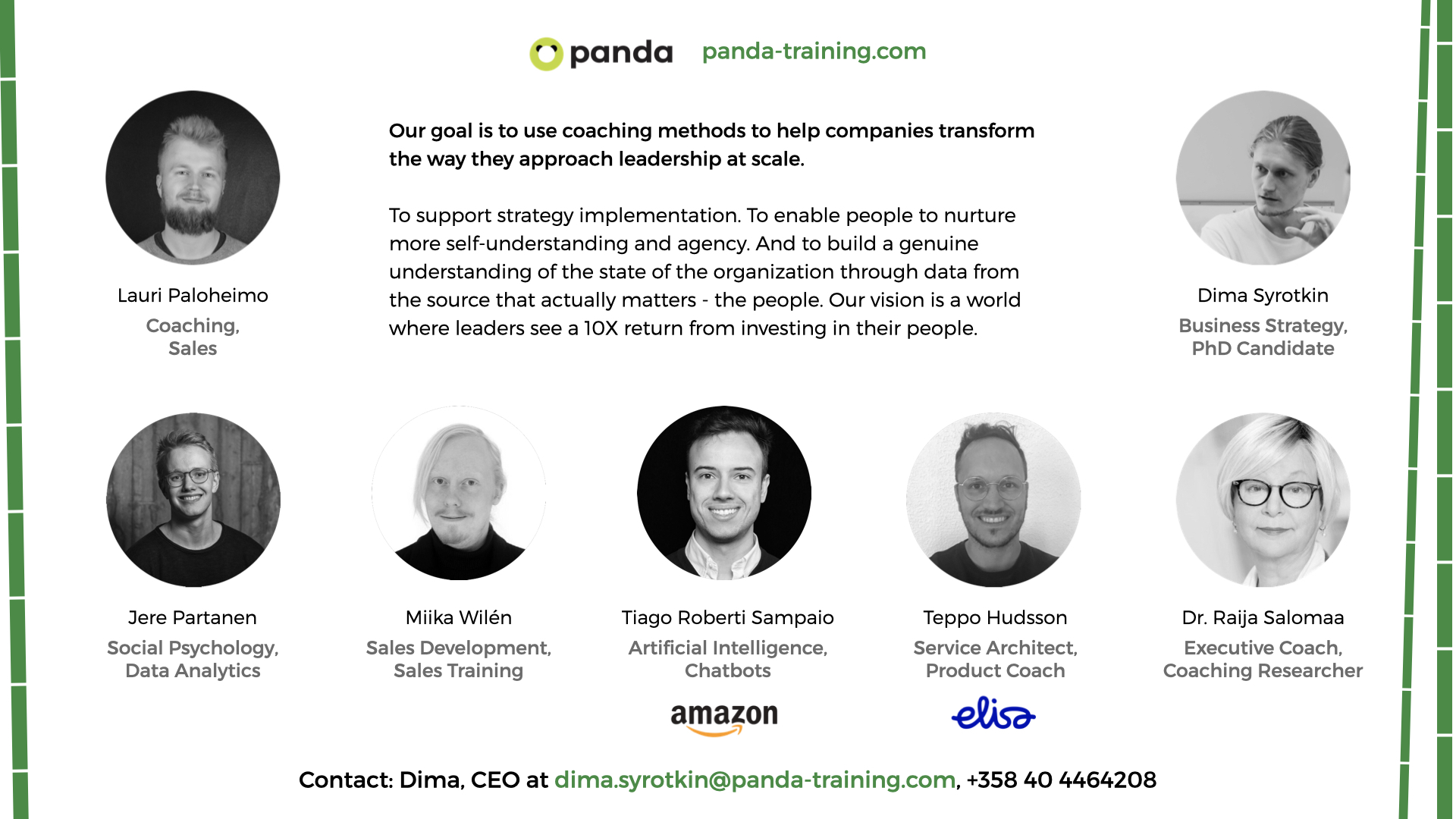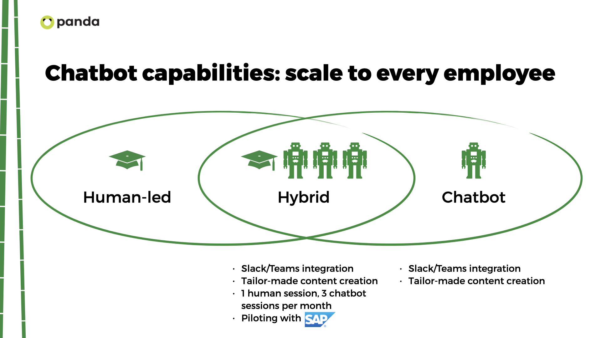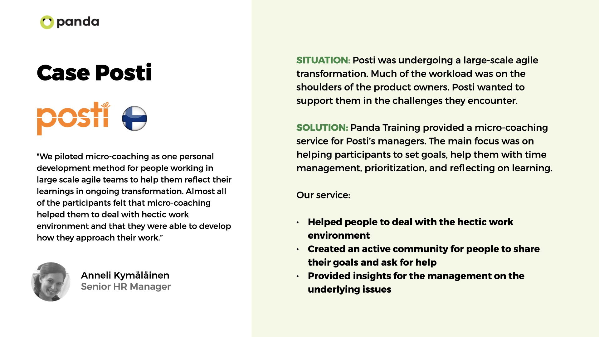 Traditional coaching is a powerful tool that supports change. Panda’s micro-coaching solution brings it a step further by (a) making coaching scalable and affordable, and (b) allowing everyone to be aware of what’s going on in the company through knowledge sharing and data collection. All this made possible by utilizing both human expert-led coaching via text/Teams/Slack and AI chatbot tech.