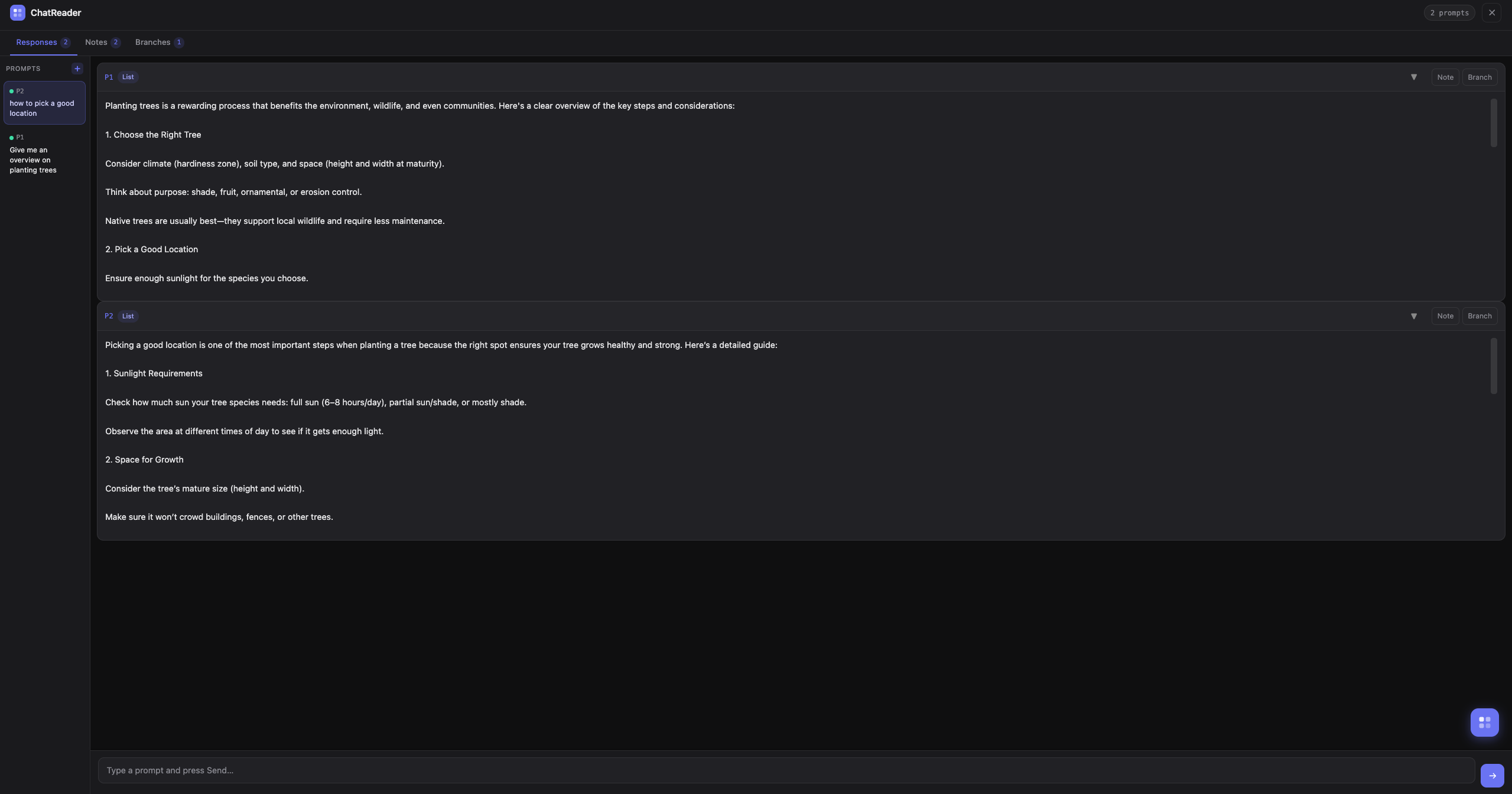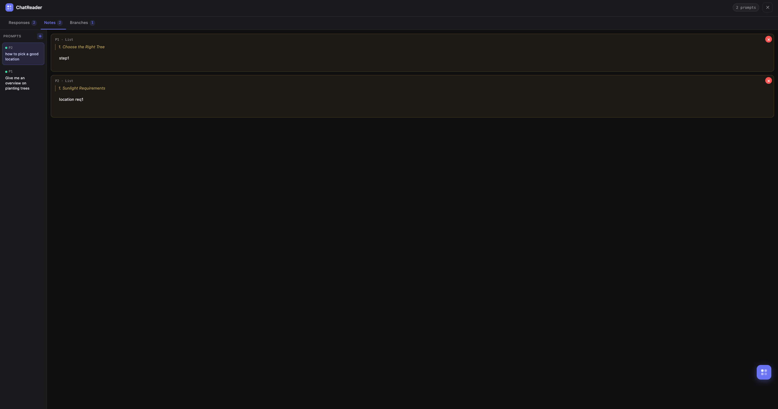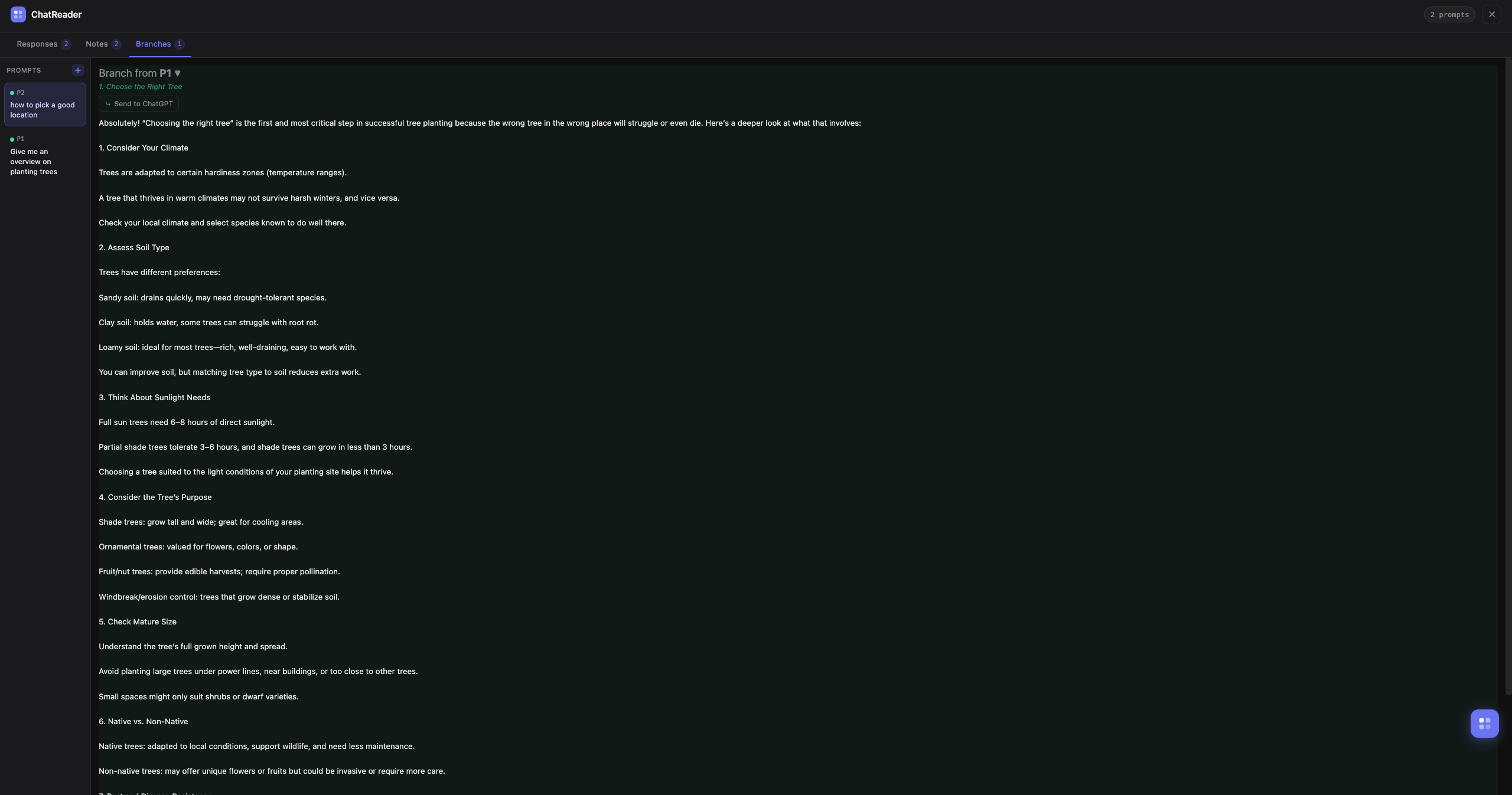 I built ChatReader as a Chrome web extension using JavaScript, HTML, and CSS with the help of AI tools like Claude Sonnet 4.6, GPT 4, Copilot. The extension injects a custom interface into the ChatGPT webpage and interacts with the page’s DOM to send prompts and capture responses. It's implemented with state management for prompts, notes, and branches, along with dynamic UI components for organizing conversations and displaying AI responses in a structured format.