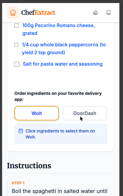 Unfortunately, it seems food delivery platforms don't allow adding ingredients to users' "shopping carts" through API. So we cannot do that for users. However, thanks to Gemini 3, we can use a workaround so that when users click on an ingredient, they land on that ingredient's page on their preferred delivery platform.