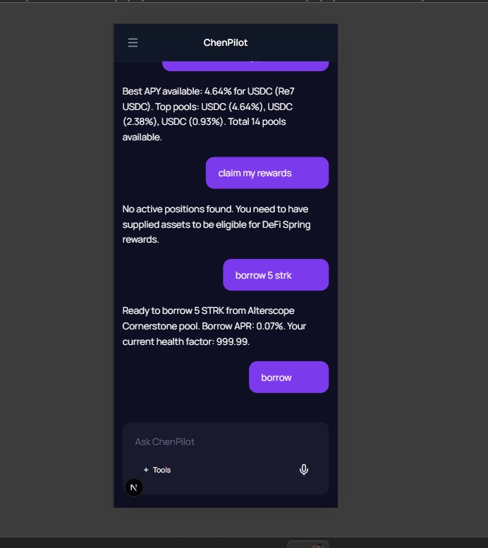 The inspiration for ChenPilot came from a painful reality in decentralized finance (DeFi): complexity kills adoption. As experienced crypto users, we constantly struggled with the fragmented process of moving assets, swapping tokens, and executing multi-step yield strategies across different blockchains (e.g., Bitcoin, Starknet). Each action requires switching wallets, navigating bridges, and approving transactions on separate, confusing interfaces.